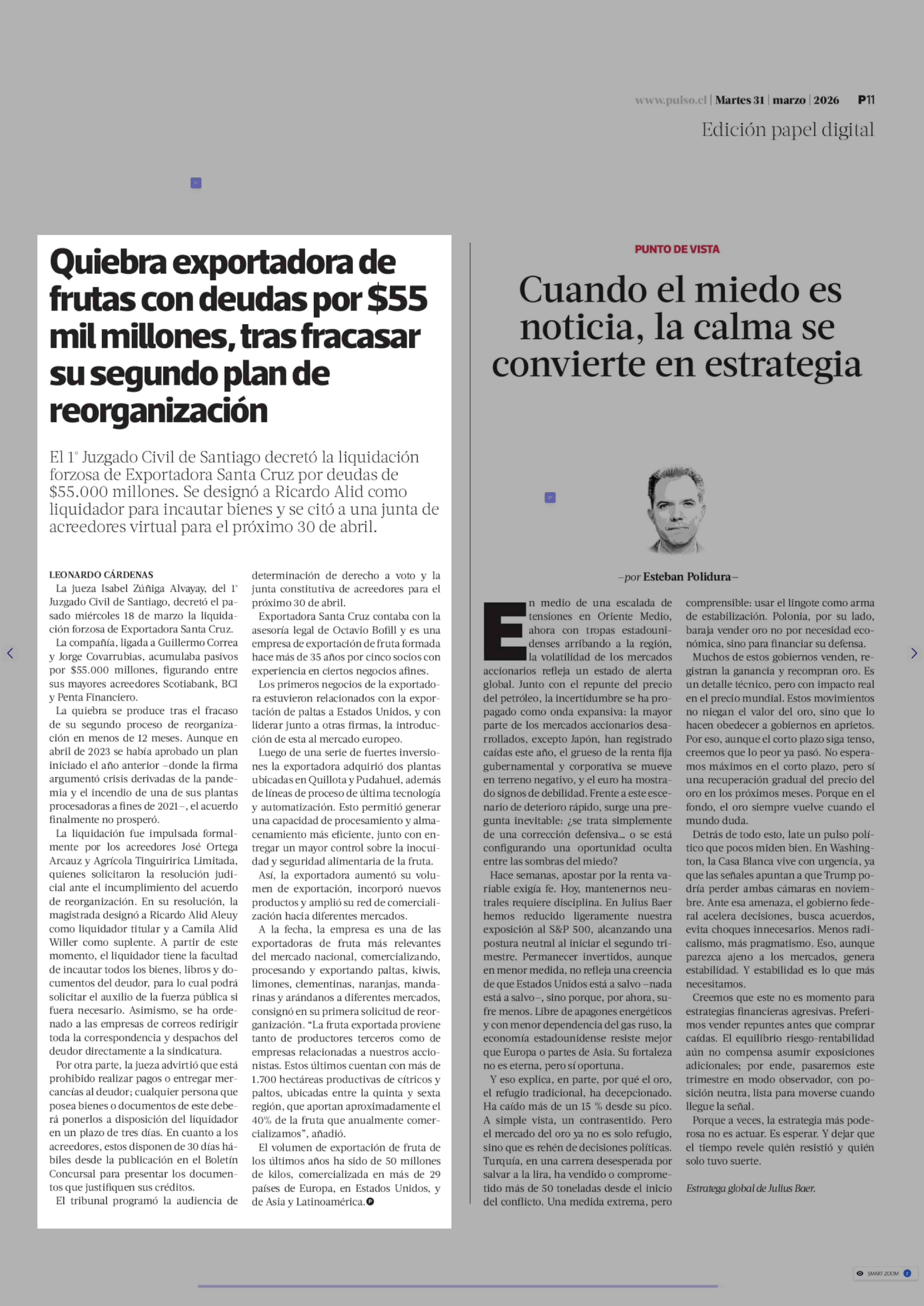 Quiebra exportadora de frutas con deudas por $55 mil millones, tras fracasar su segundo plan de reorganización 31-03-2026 La Tercera |