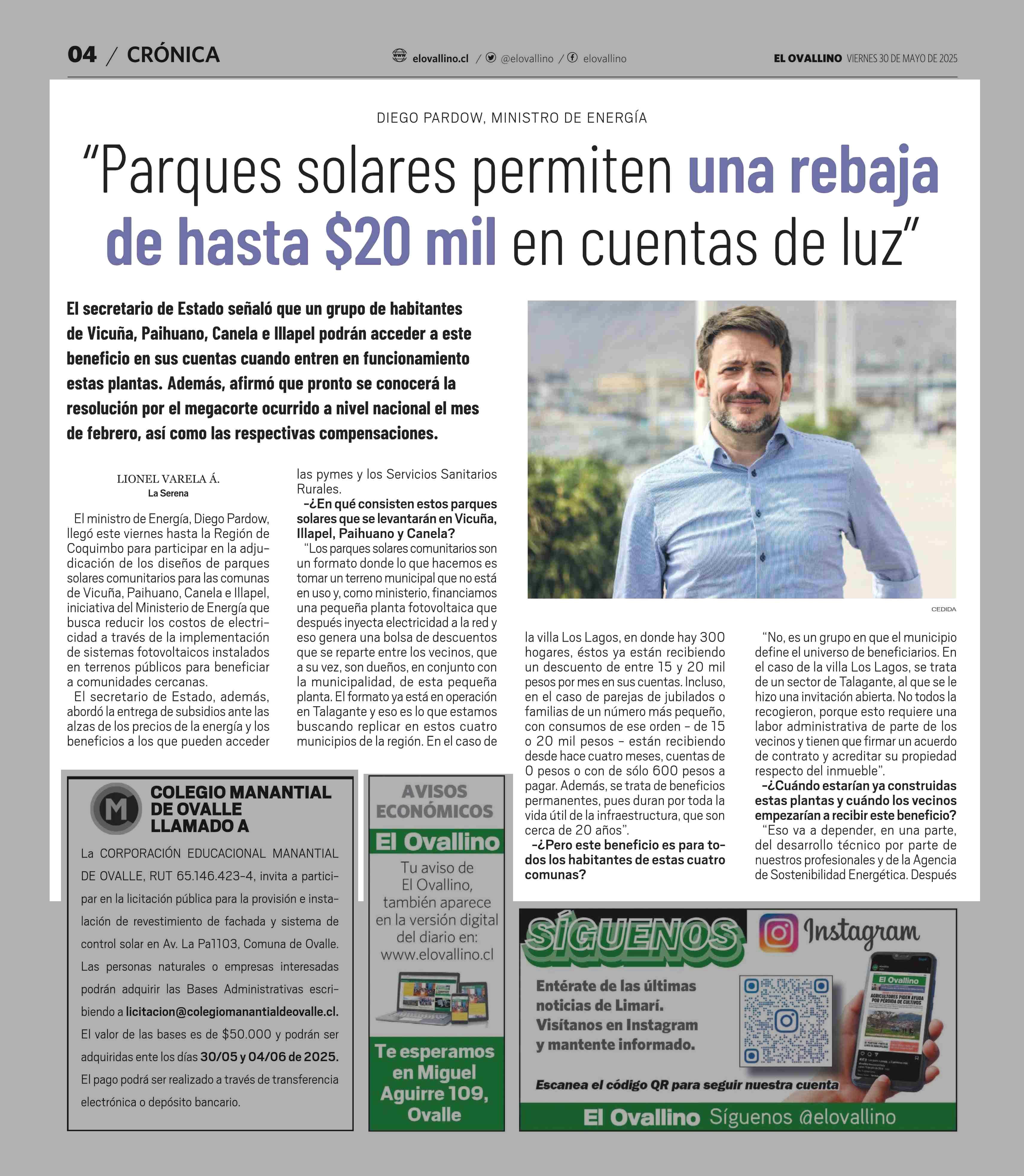 “Parques solares permiten una rebaja de hasta $20 mil en cuentas de luz” 30-05-2025 El Ovallino |