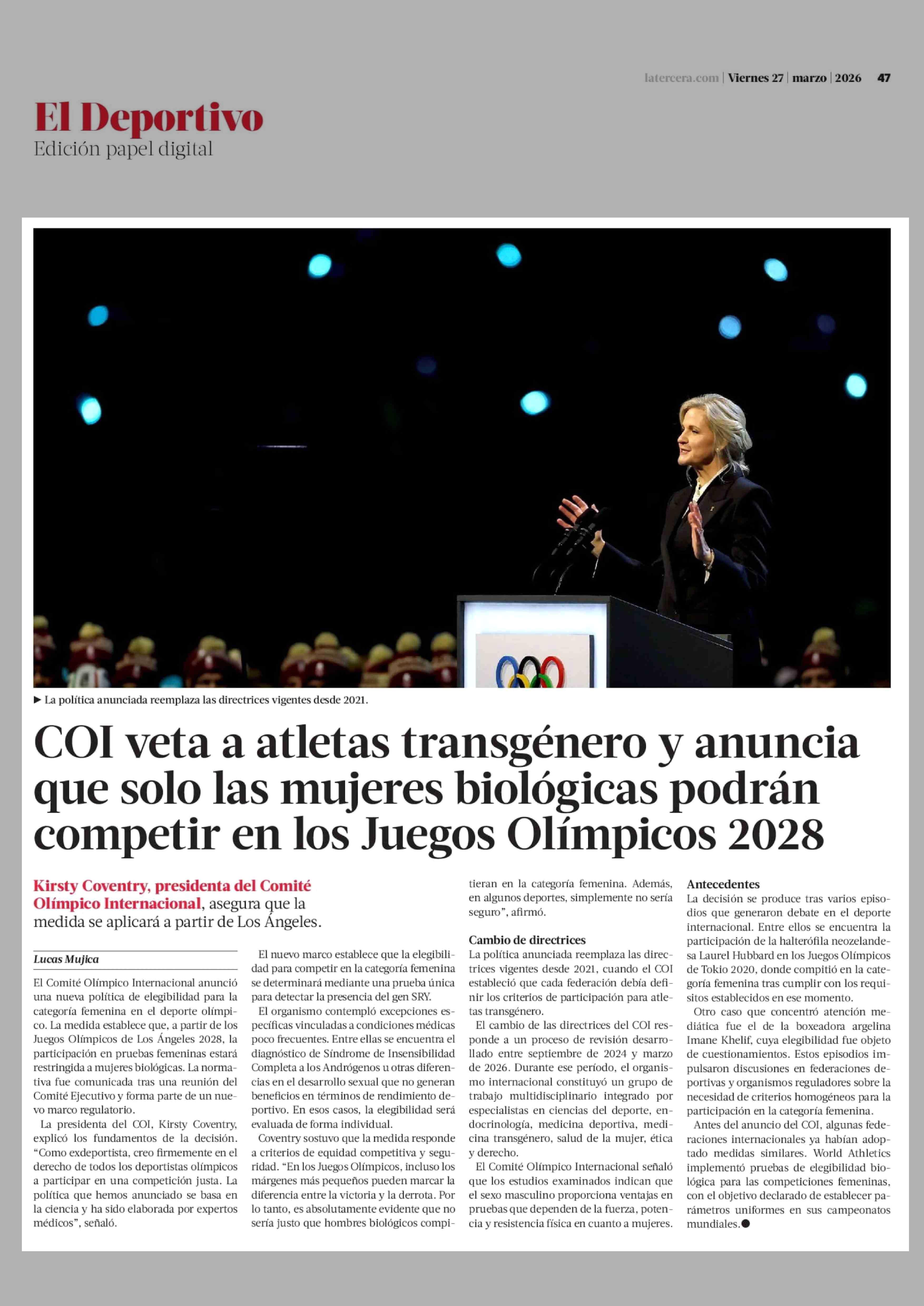 COI veta a atletas transgénero y anuncia que solo las mujeres biológicas podrán competir en los Juegos Olímpicos 2028 27-03-2026 La Tercera |