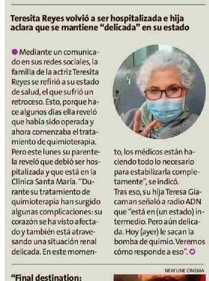 Título: Teresita Reyes volvió a ser hospitalizada e hija aclara que se mantiene “delicada” en su estado