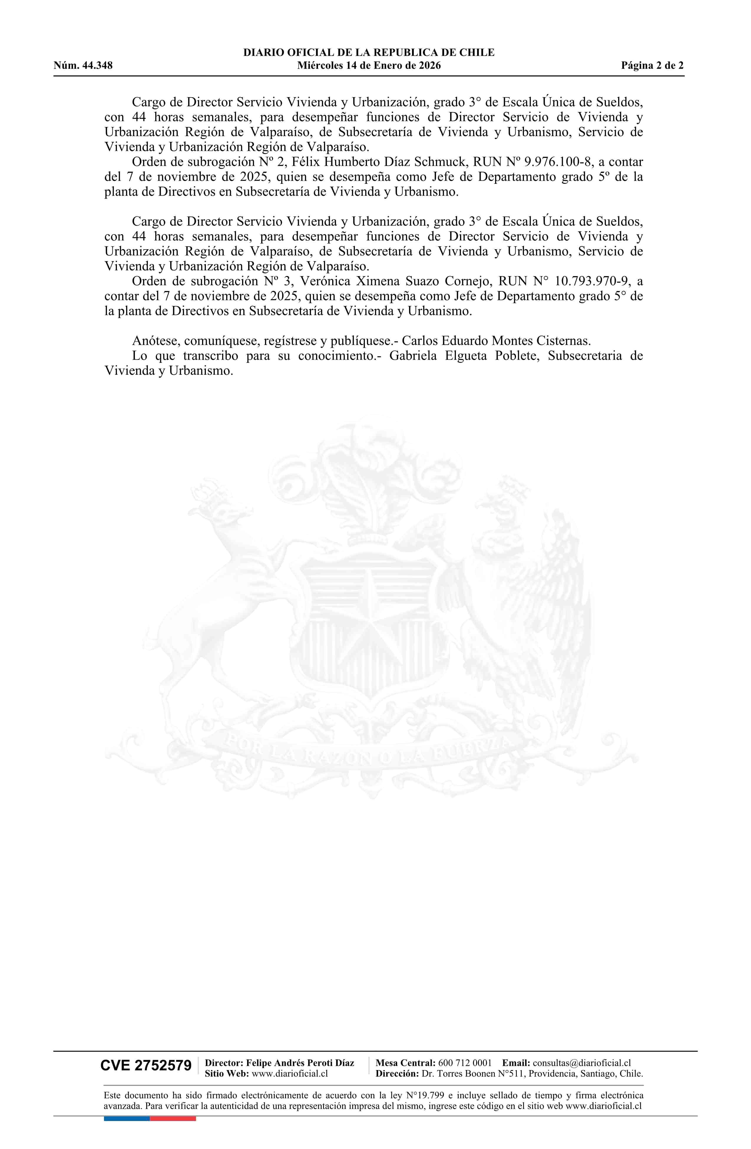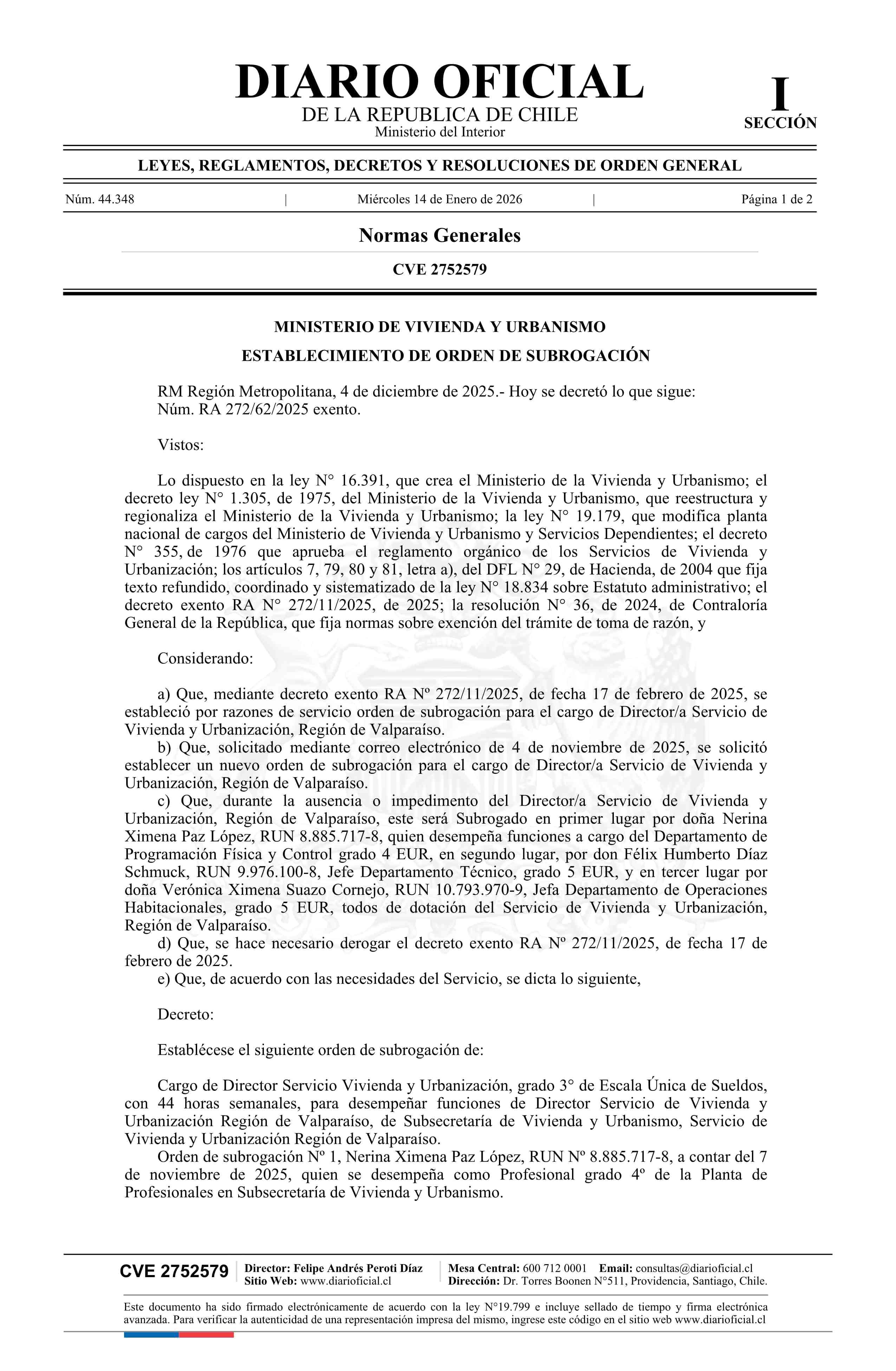 | Título: | Decreto exento número RA 272/62/2025, de 2025.- Establece orden de subrogación |