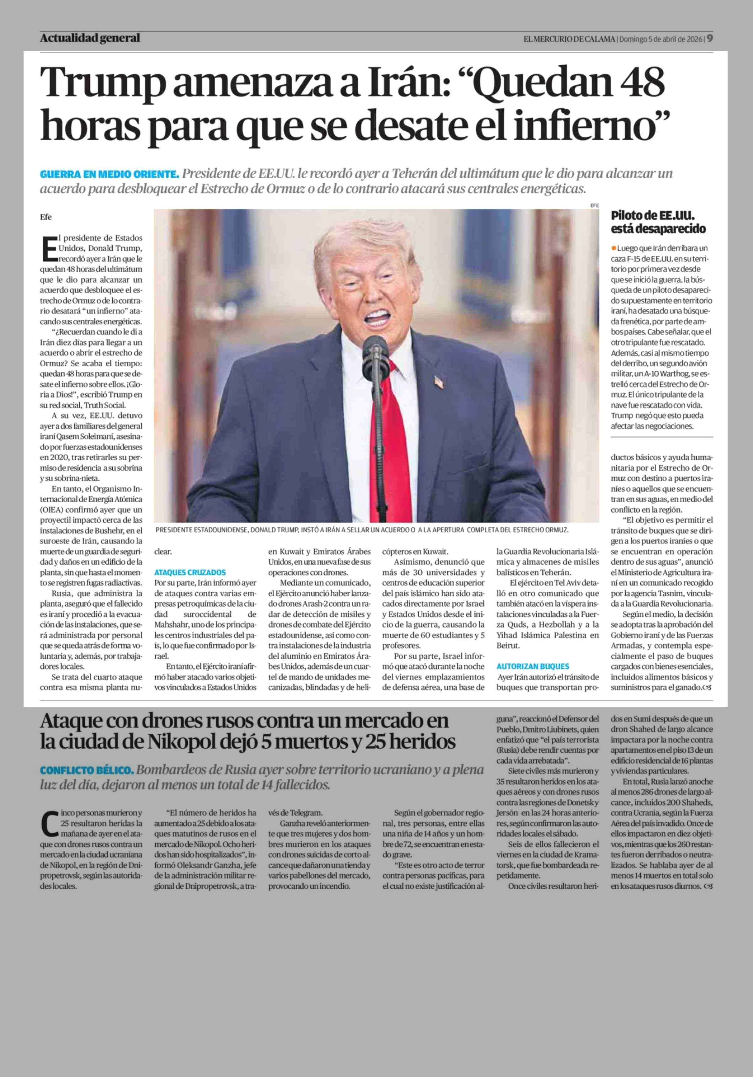 Trump amenaza a Irán: "Quedan 48 horas para que se desate el infierno" 05-04-2026 El Mercurio de Calama |