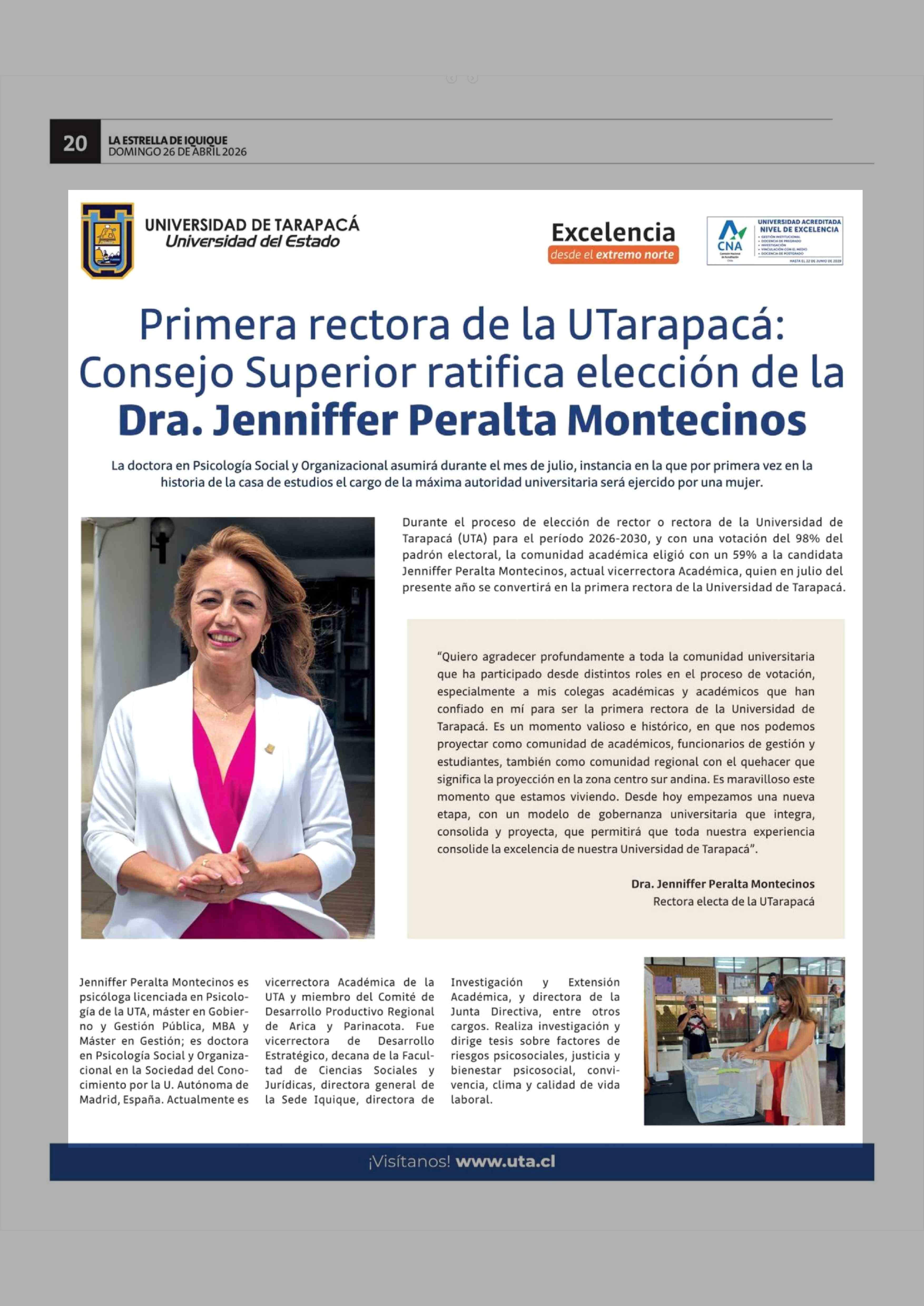Primera rectora de la UTarapacá: Consejo Superior ratifica elección de la Dra. Jenniffer Peralta Montecinos 26-04-2026 La Estrella de Iquique |
