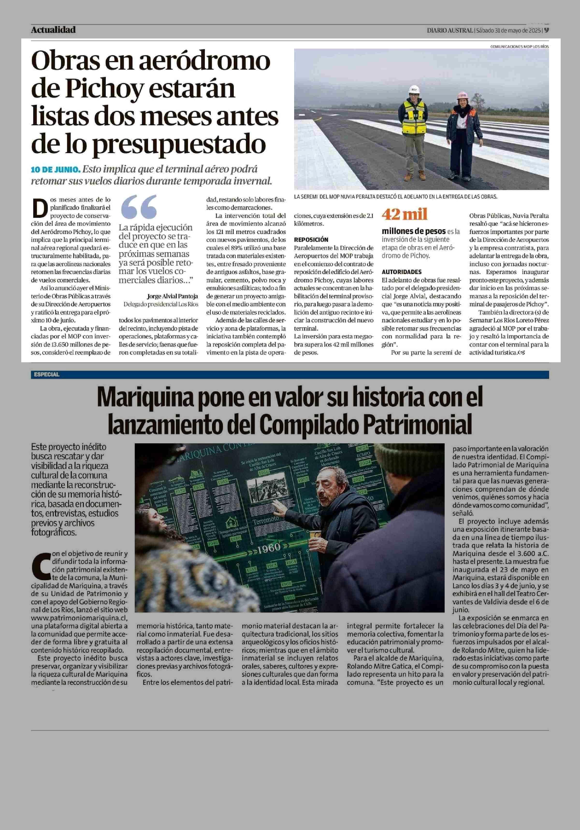 Obras en aeródromo de Pichoy estarán listas dos meses antes de lo presupuestado 31-05-2025 Diario Austral Región de Los Ríos |