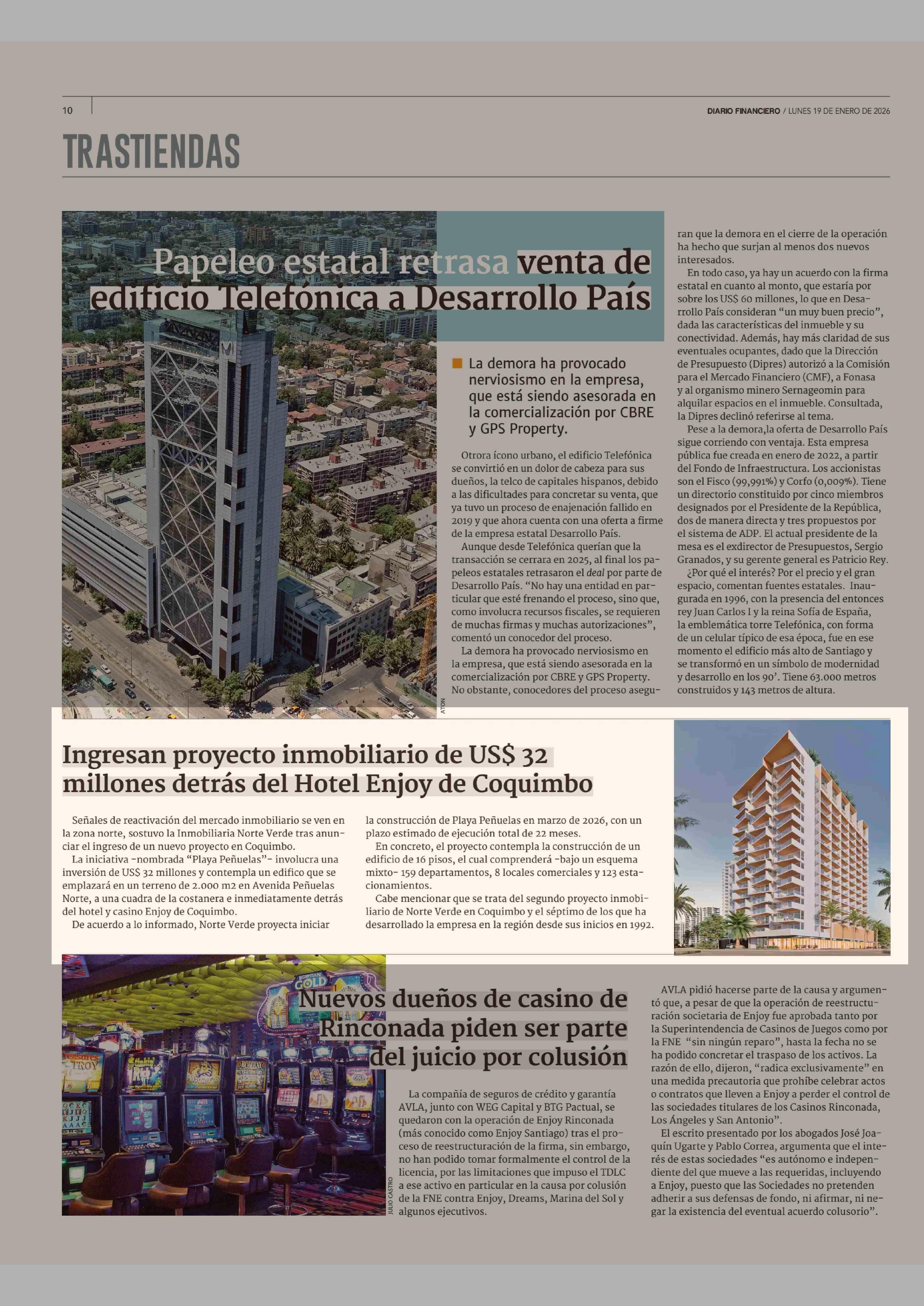 Ingresan proyecto inmobiliario de US$ 32 millones detrás del Hotel Enjoy de Coquimbo 19-01-2026 Diario Financiero |