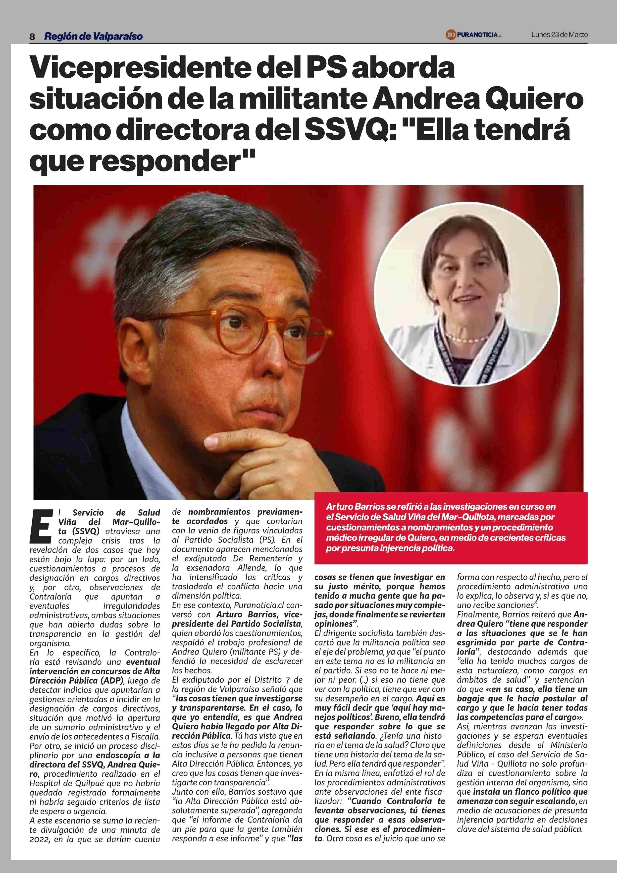 Título: Vicepresidente del PS aborda situación de la militante Andrea Quiero como directora del SSVQ: "Ella tendrá que responder”