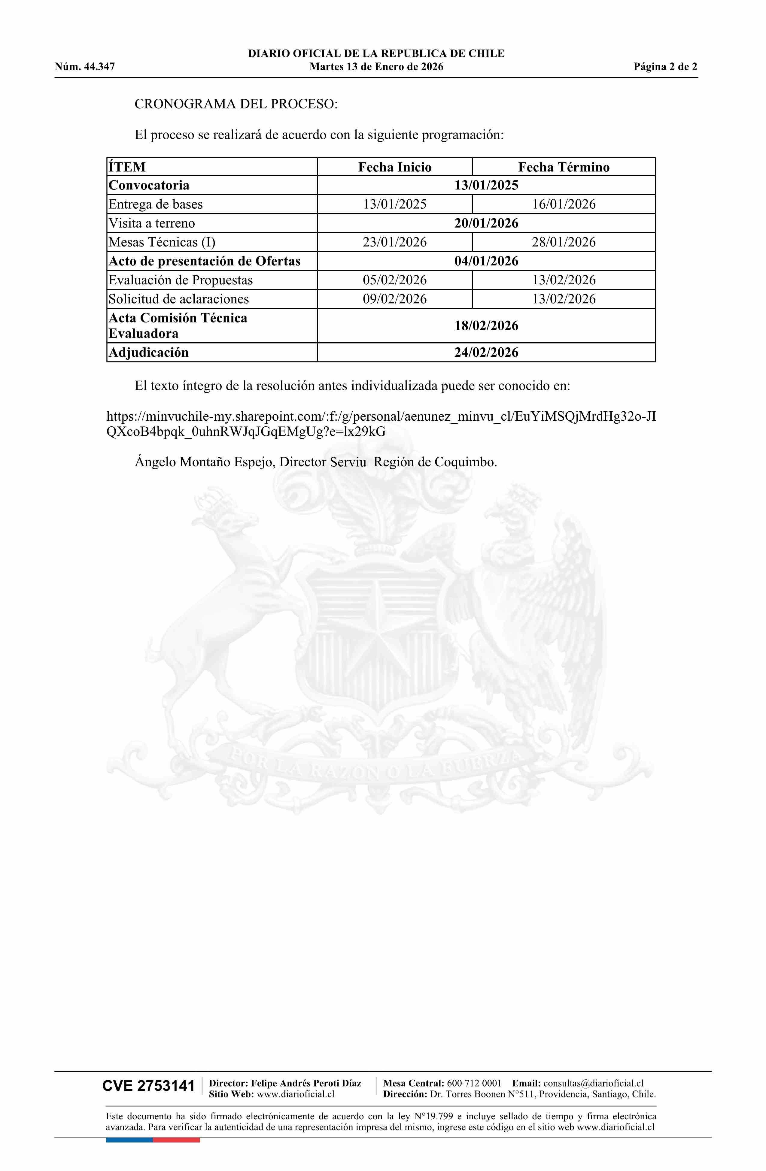 Extracto de resolución exenta número 28, de 2026.- Aprueba Bases técnicas y administrativas, y sus modificaciones, de Concurso para proyecto habitacional en terreno de propiedad del Serviu en comuna de Salamanca 13-01-2026 DIARIO OFICIAL CHILE - BOLETÍN OFICIAL DE MINERÍA |