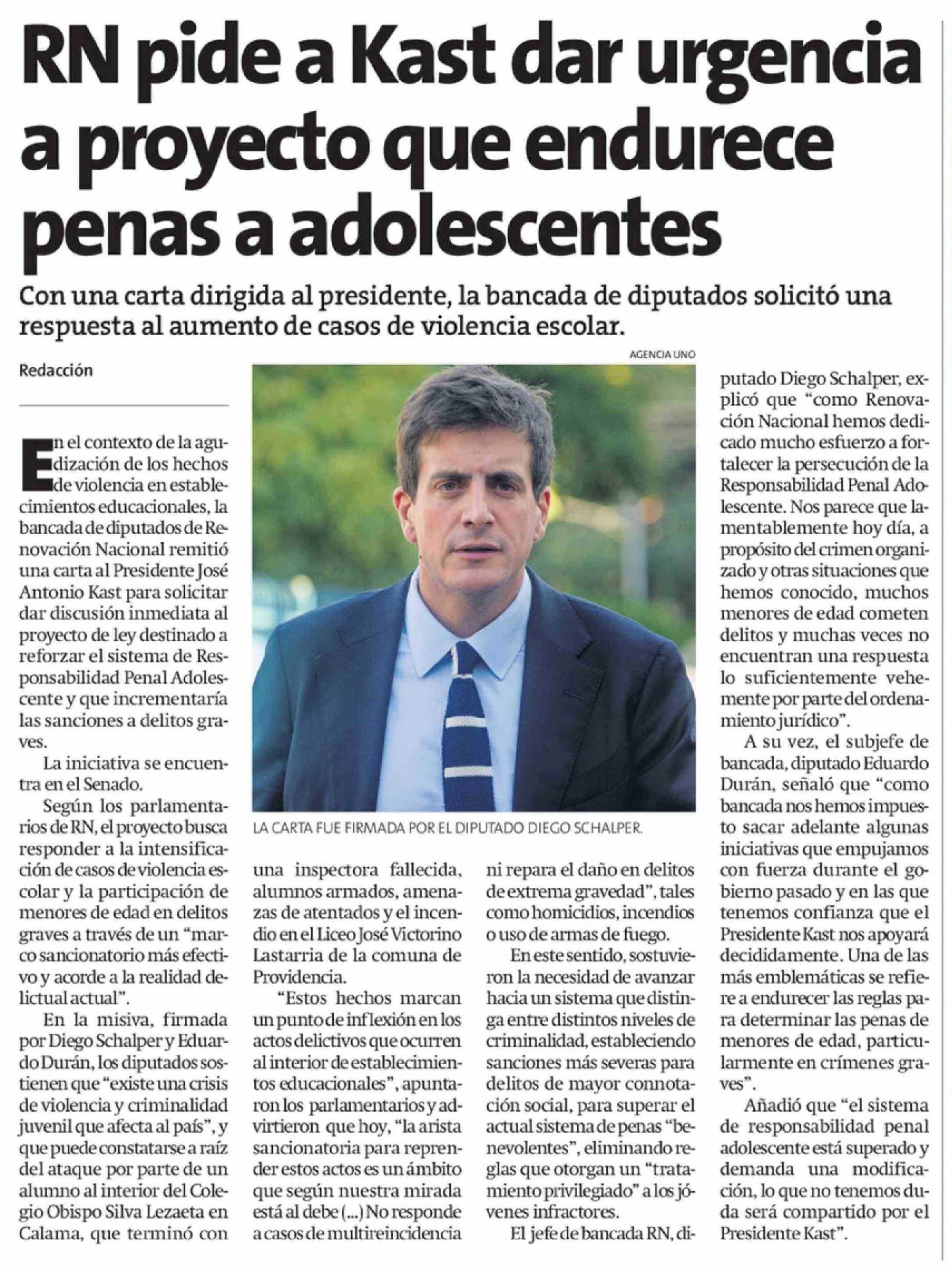 Título: RN pide a Kast dar urgencia a proyecto que endurece penas a adolescentes