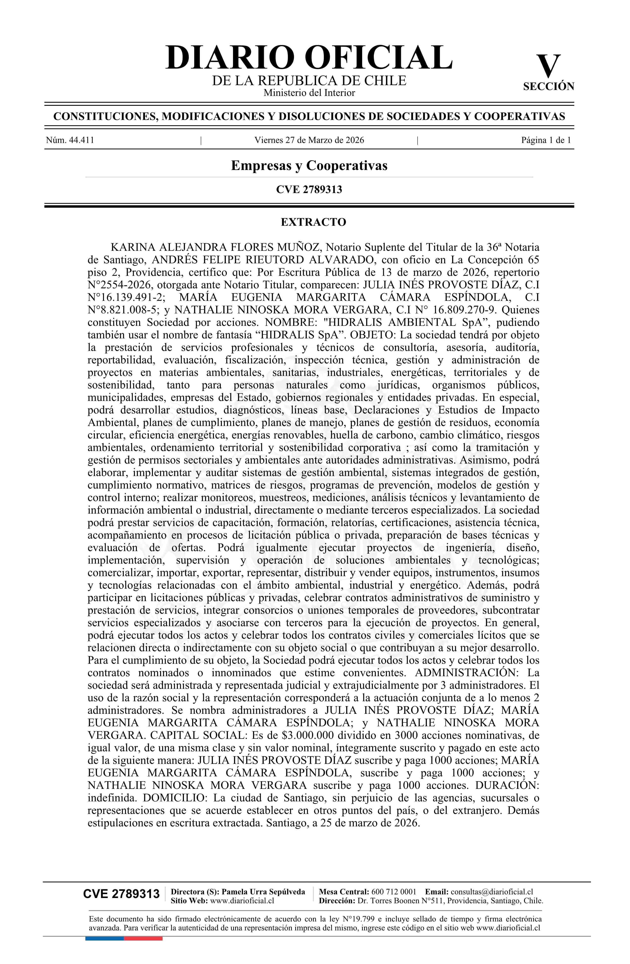 HIDRALIS AMBIENTAL SpA 27-03-2026 Diario Oficial Edición Electrónica |