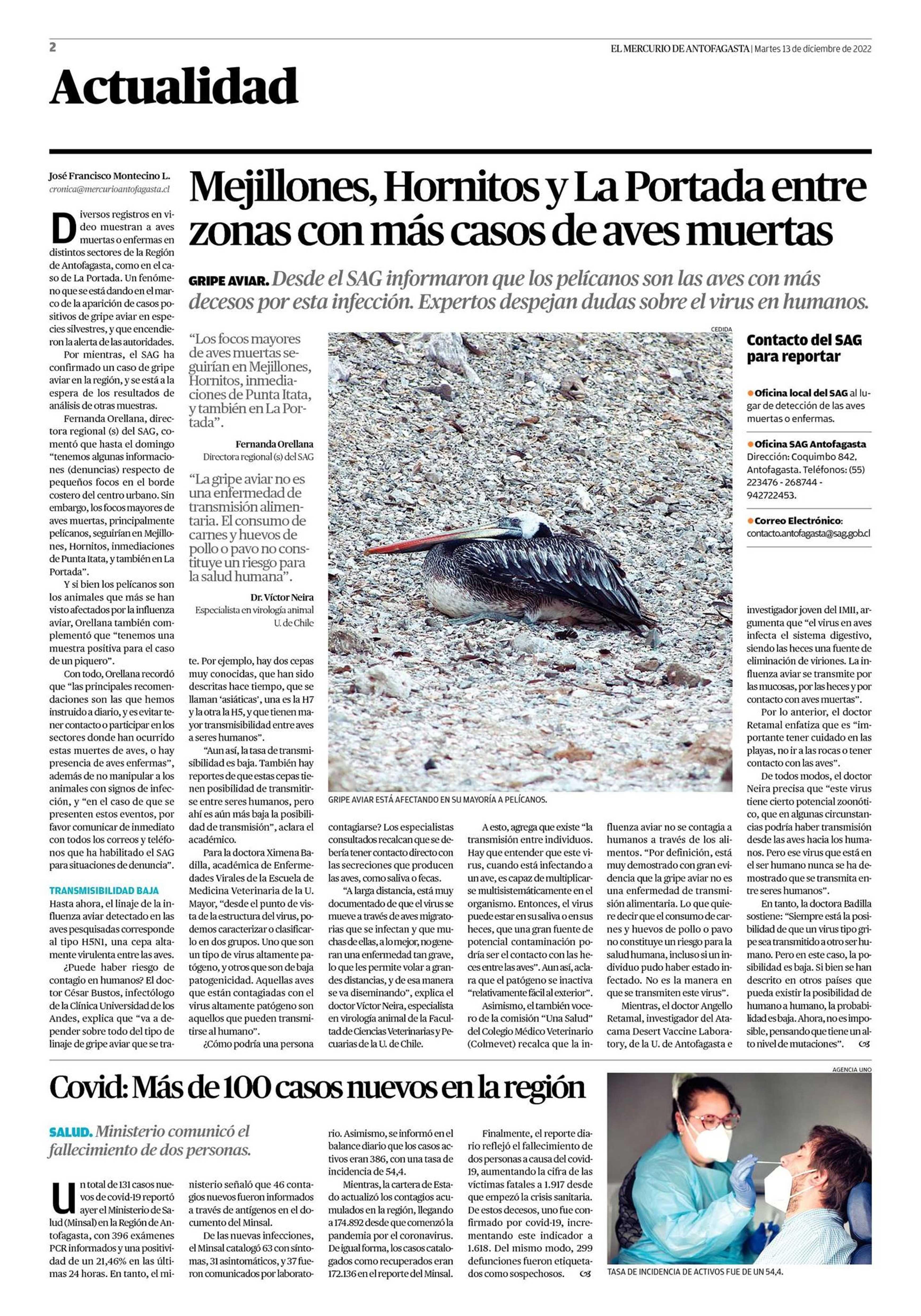 Mejillones, Hornitos y La Portada entre zonas con más casos de aves muertas 13-12-2022 El Mercurio de Antofagasta |