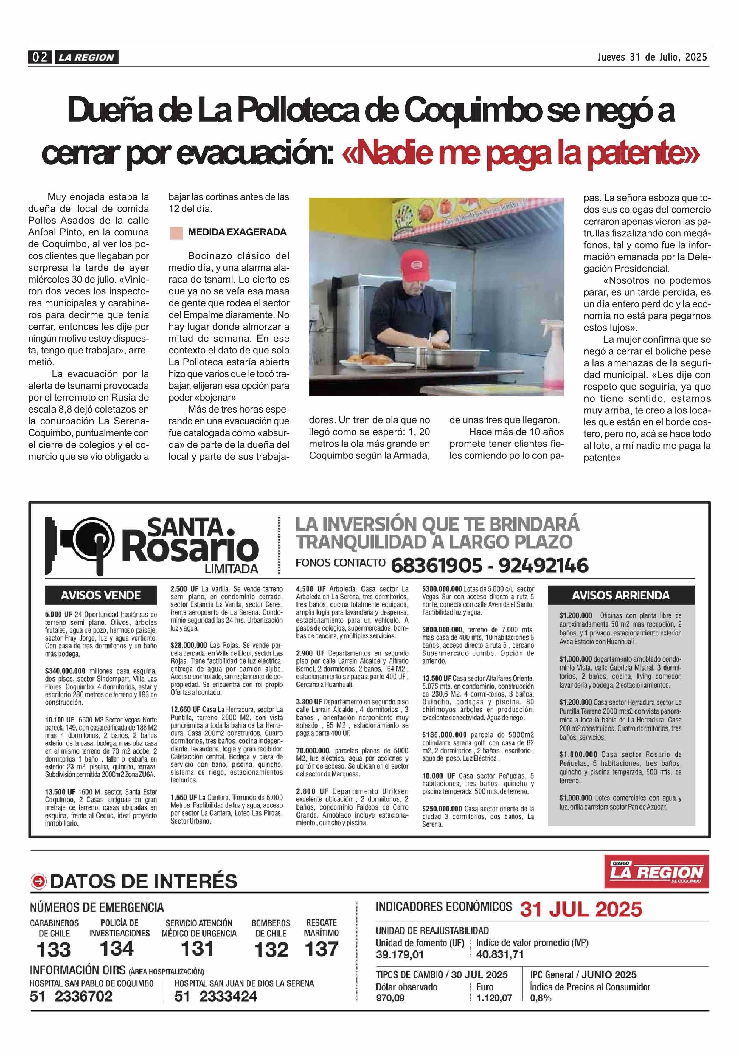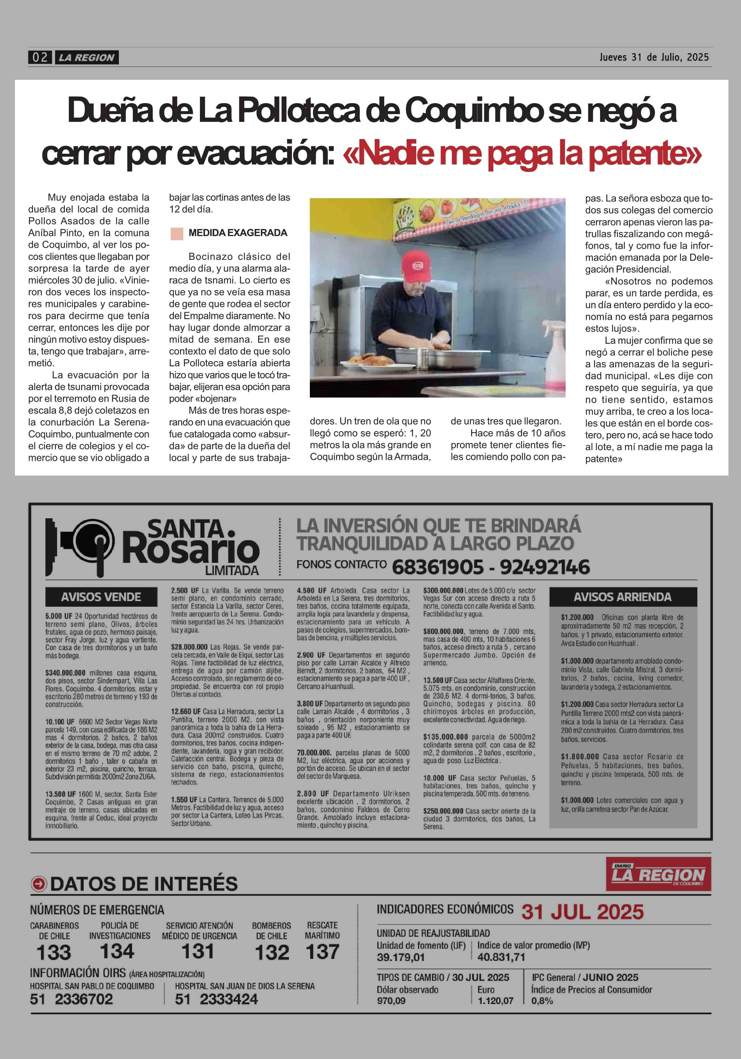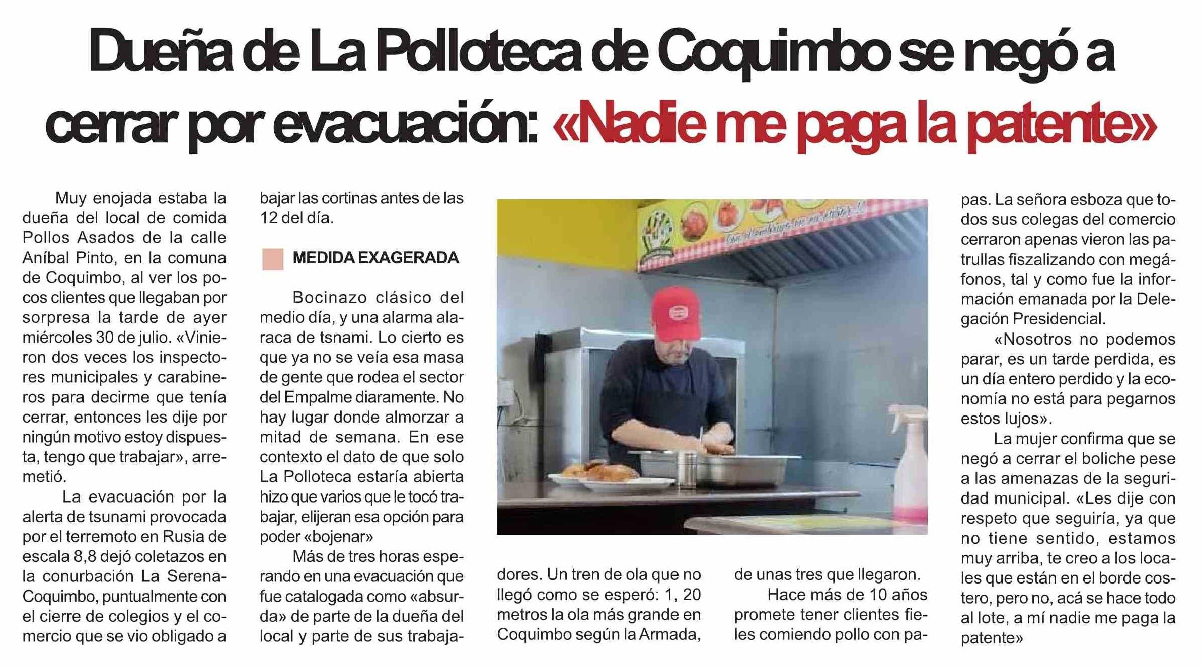 Dueña de La Polloteca de Coquimbo se negó a cerrar por evacuación: «Nadie me paga la patente» 31-07-2025 Diario la Región |