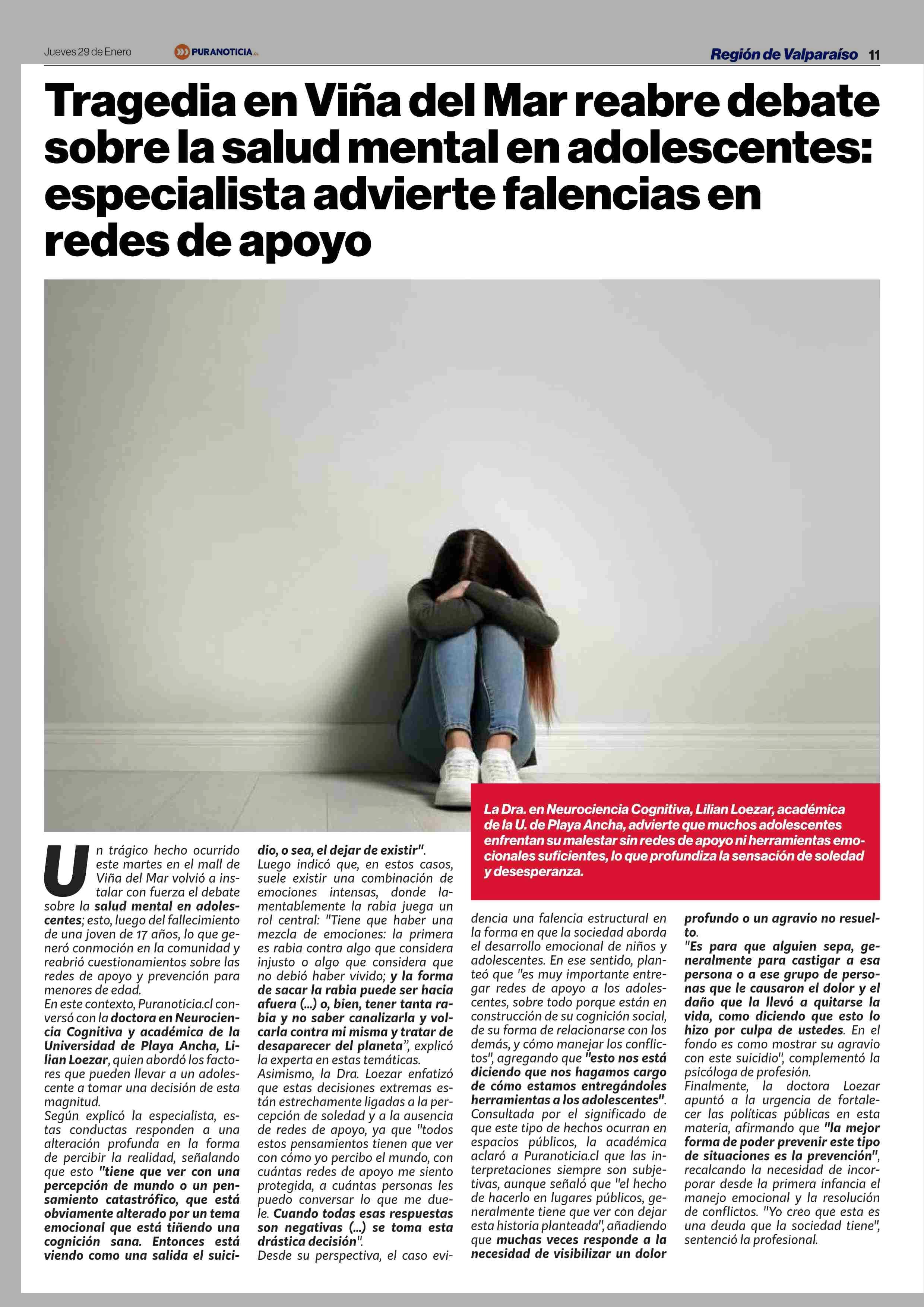 Tragedia en Viña del Mar reabre debate sobre la salud mental en adolescentes: especialista advierte falencias en redes de apoyo 29-01-2026 Puranoticia.cl |