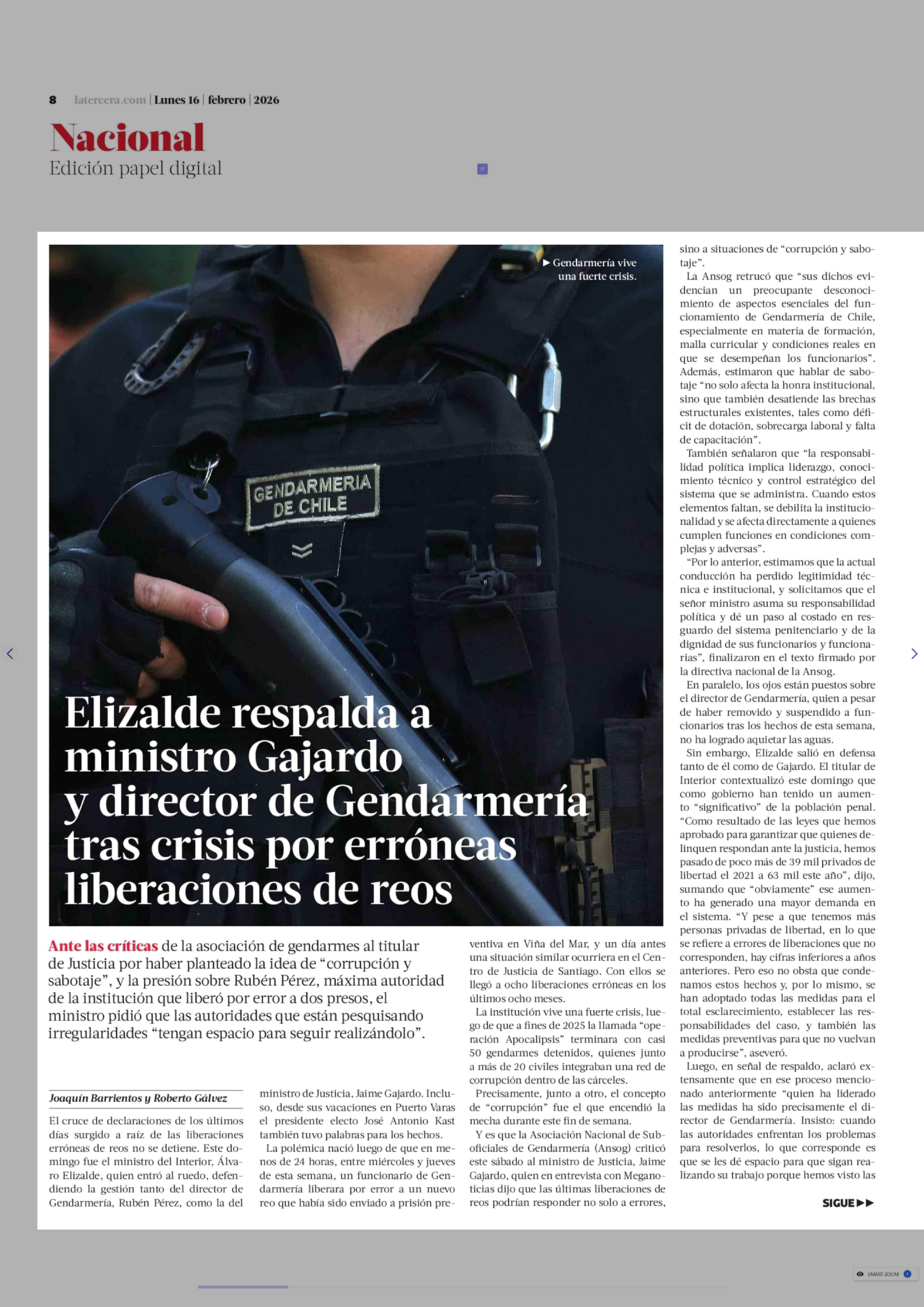 Elizalde respalda a ministro Gajardo y director de Gendarmería tras crisis por erróneas liberaciones de reos 16-02-2026 La Tercera |