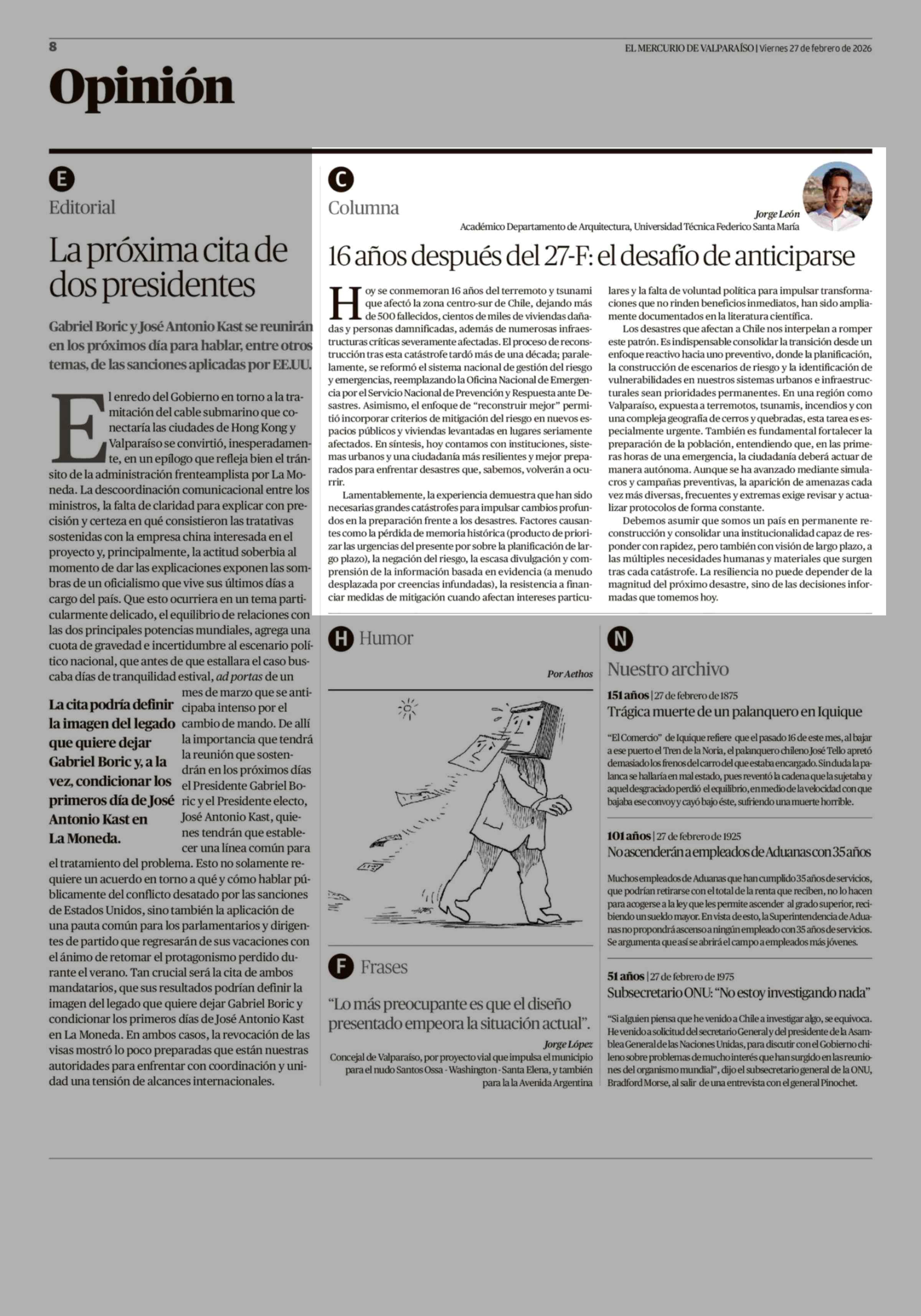 Columnas de Opinión: 16 Años después del 27-F: el desafío de anticiparse 27-02-2026 El Mercurio de Valparaíso |
