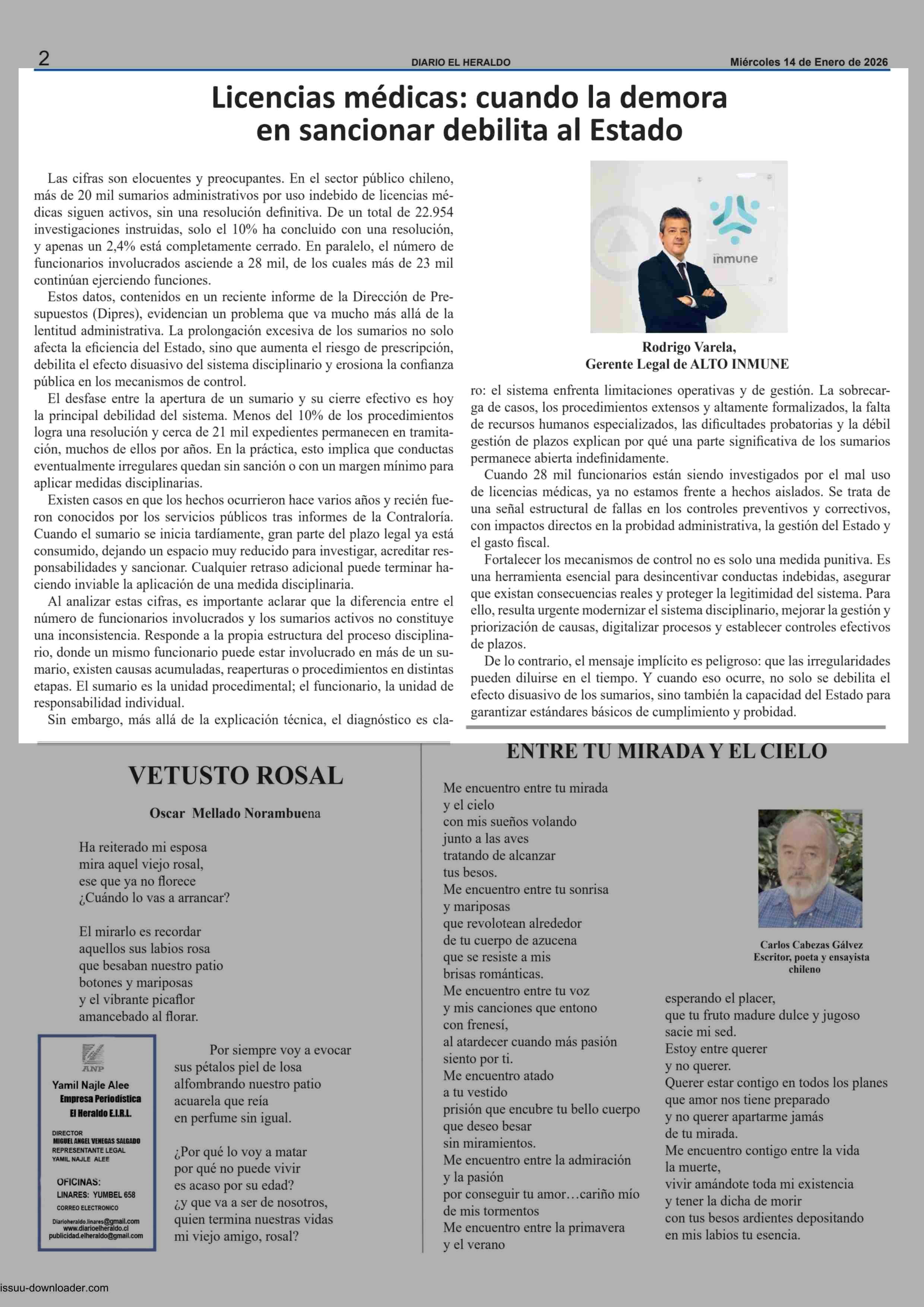Columnas de Opinión: Licencias médicas: cuando la demora en sancionar debilita al Estado 14-01-2026 El Heraldo |