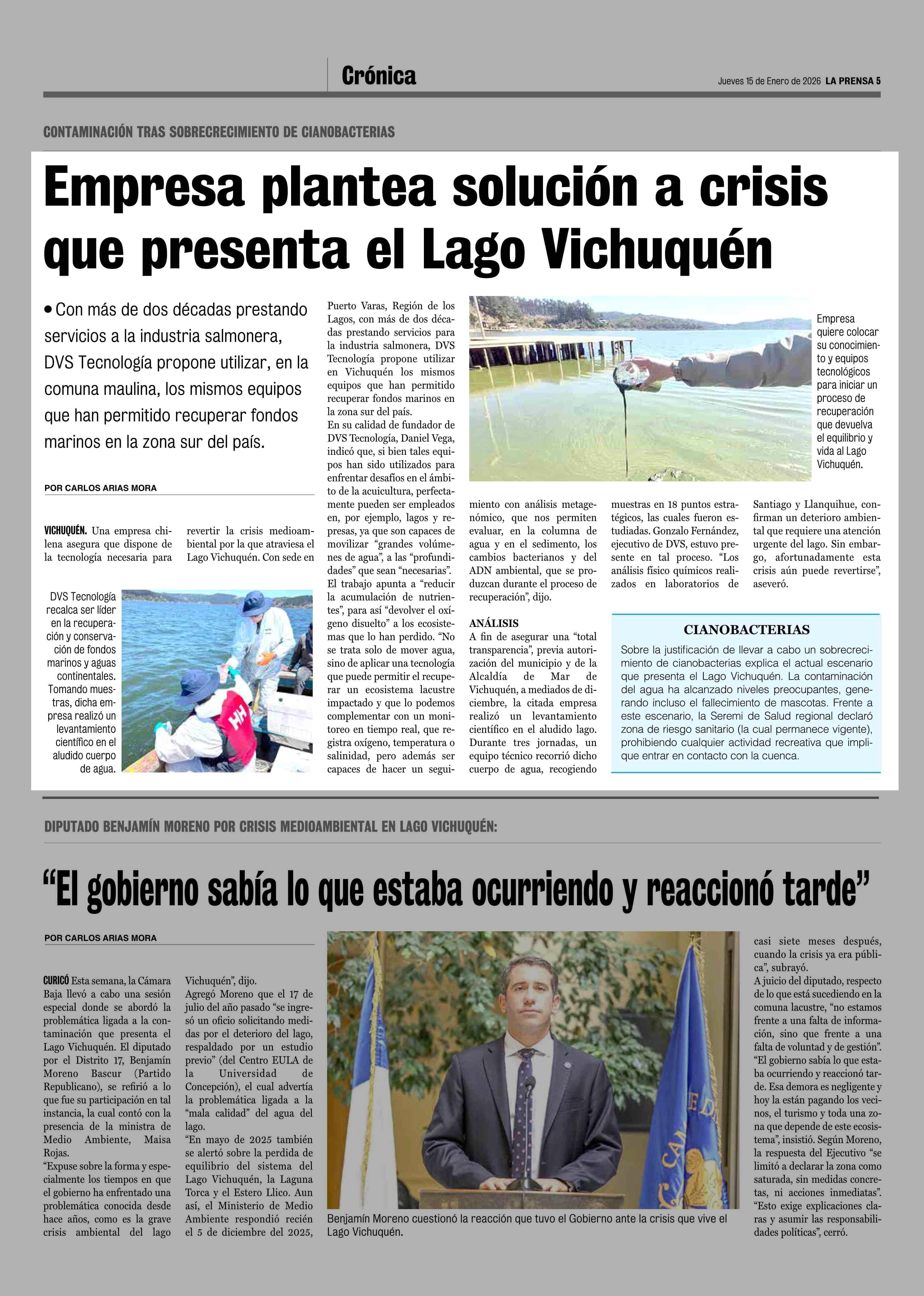 Empresa plantea solución a crisis que presenta el Lago Vichuquen 15-01-2026 La Prensa de Curicó |