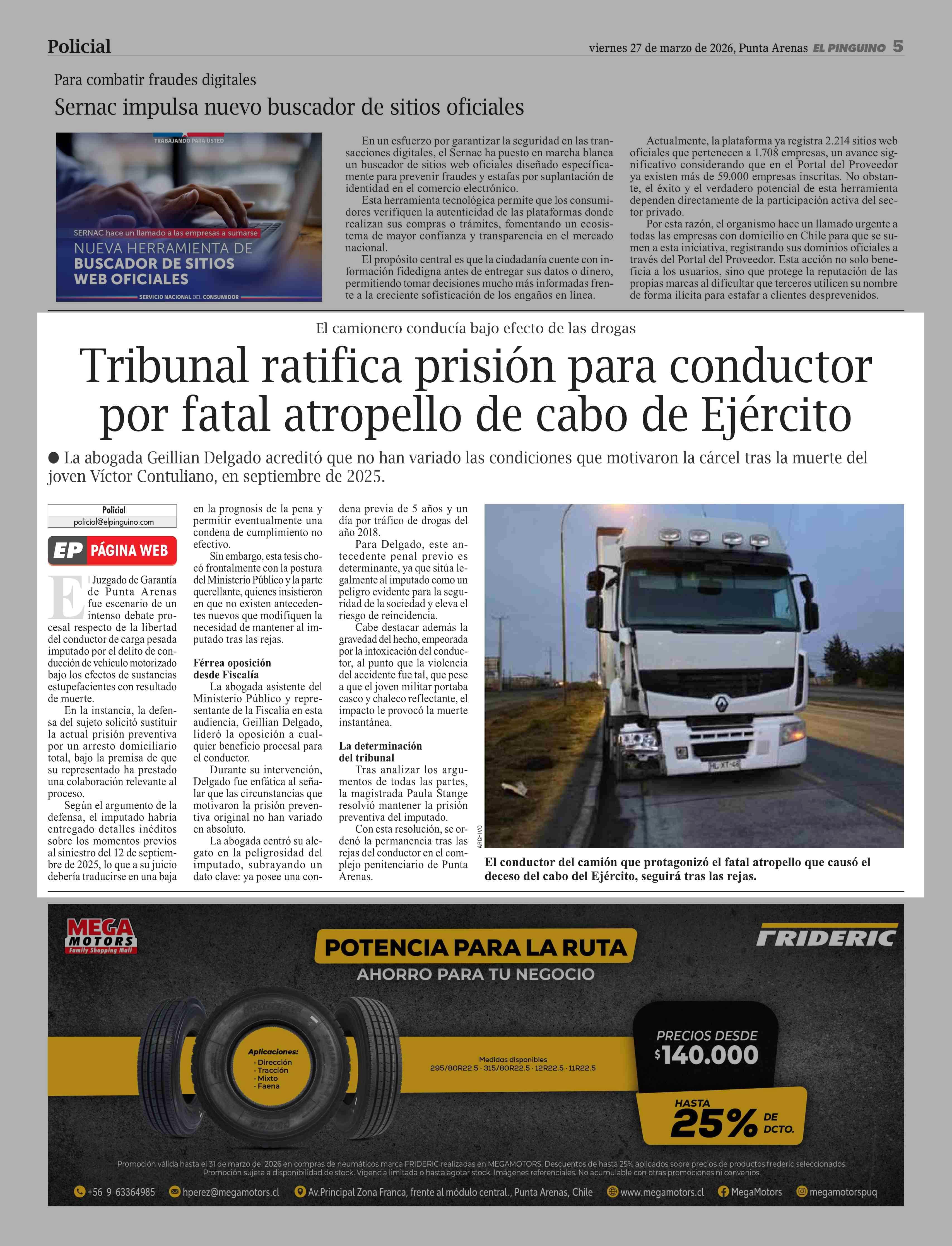 Tribunal ratifica prisión para conductor por fatal atropello de cabo de Ejército 27-03-2026 El Pingüino |