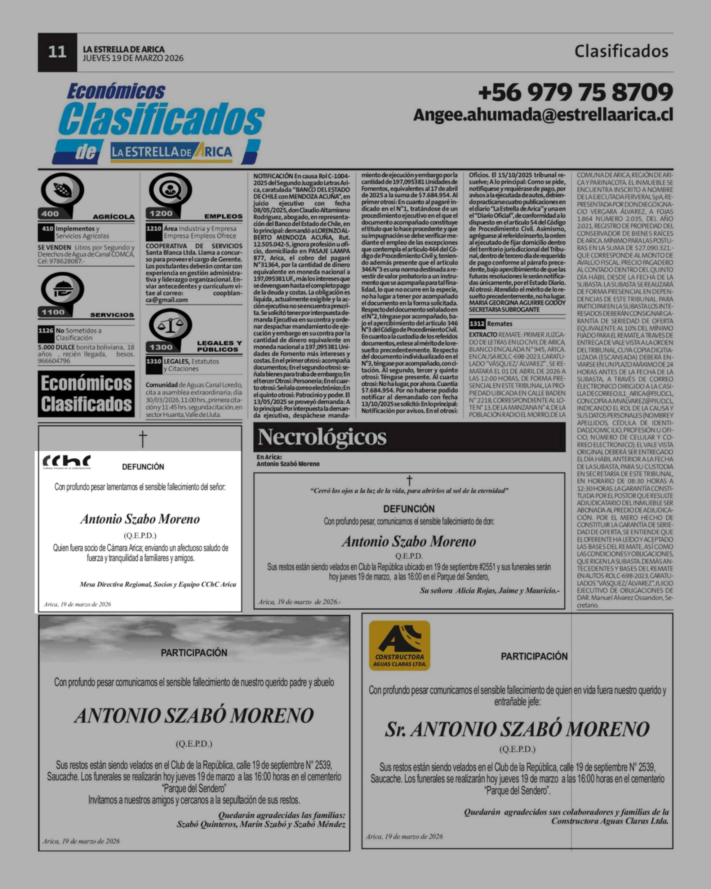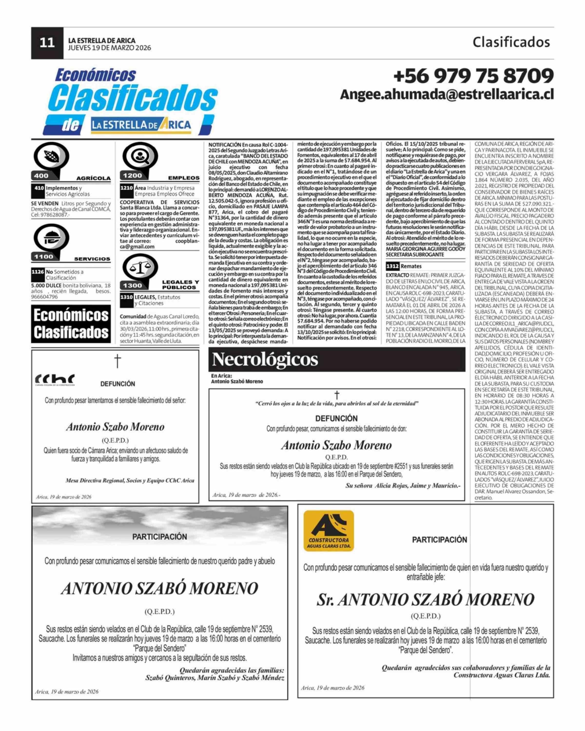 Obituario: DEFUNCIÓN CCHC 19-03-2026 La Estrella de Arica |