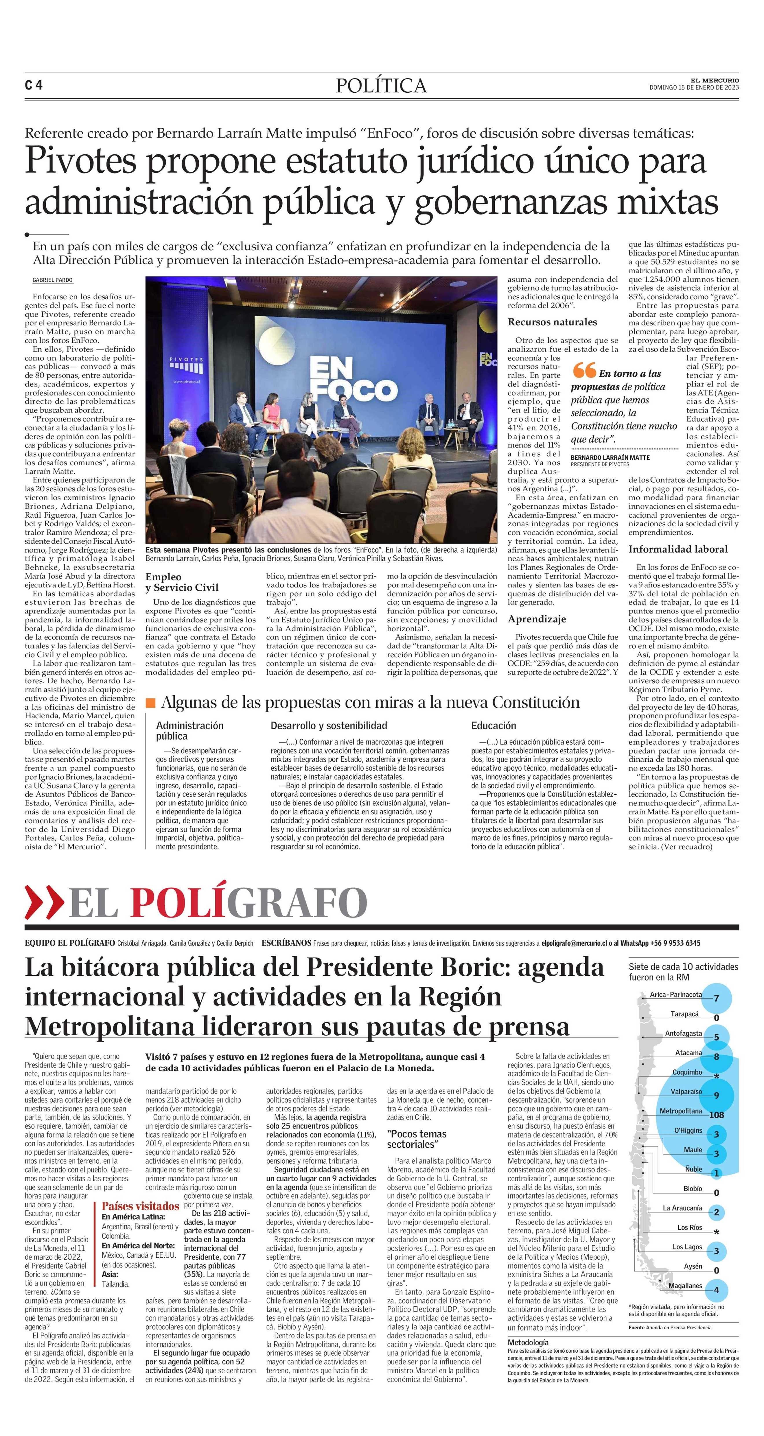 La bitácora pública del Presidente Boric: agenda internacional y actividades en la Región Metropolitana lideraron sus pautas de prensa 15-01-2023 El Mercurio |