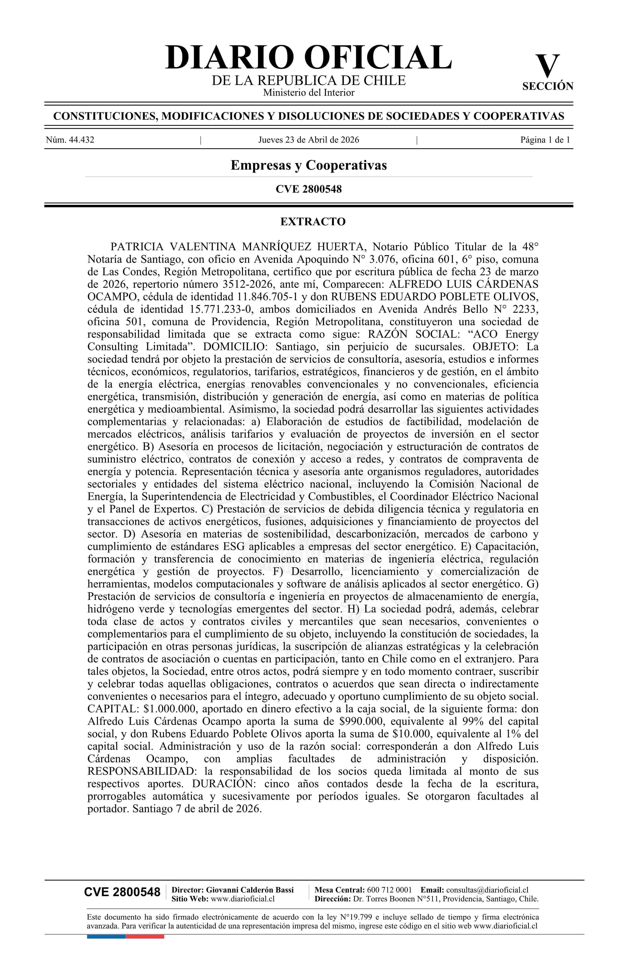ACO Energy Consulting Limitada 23-04-2026 Diario Oficial Edición Electrónica |