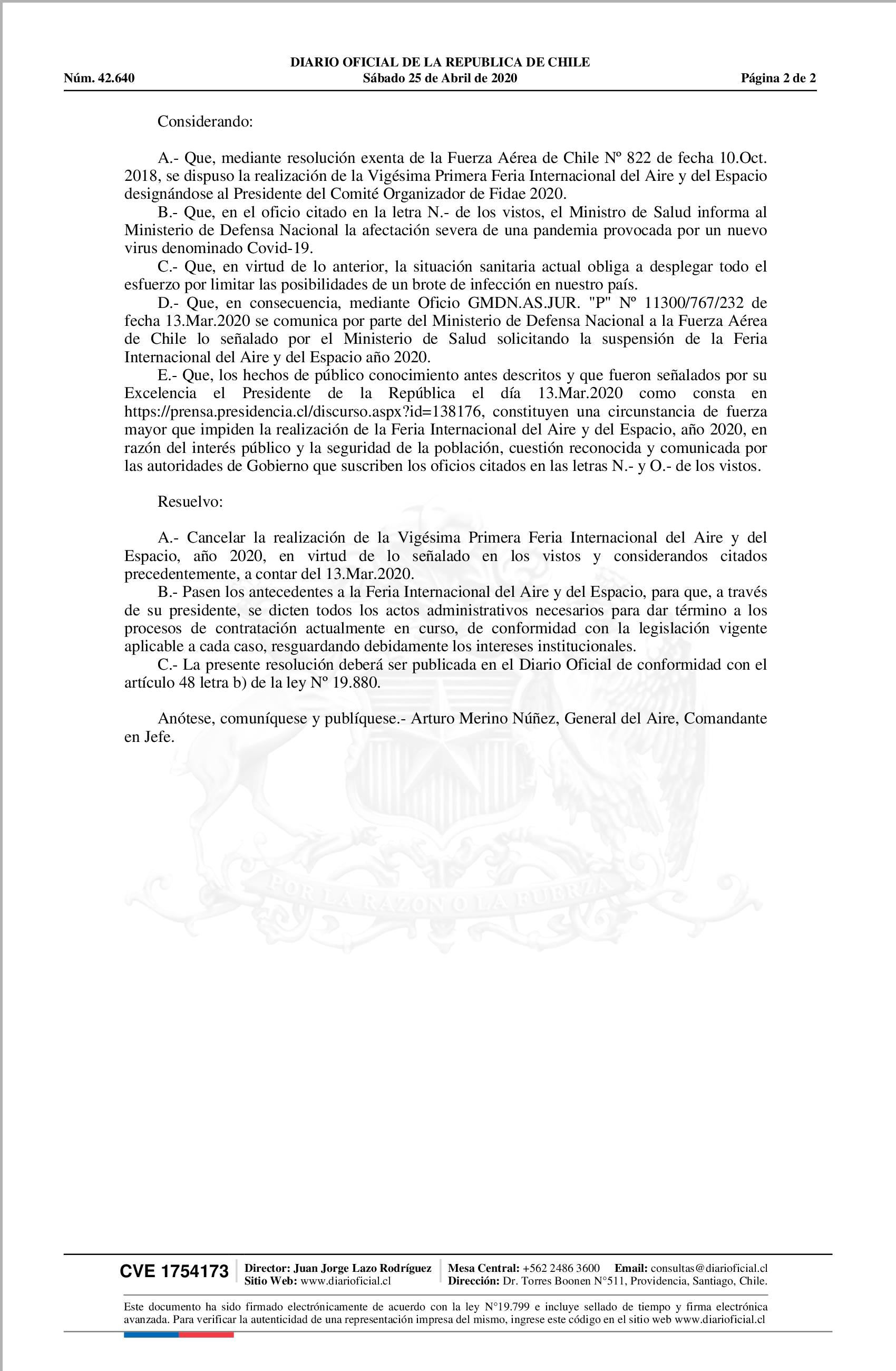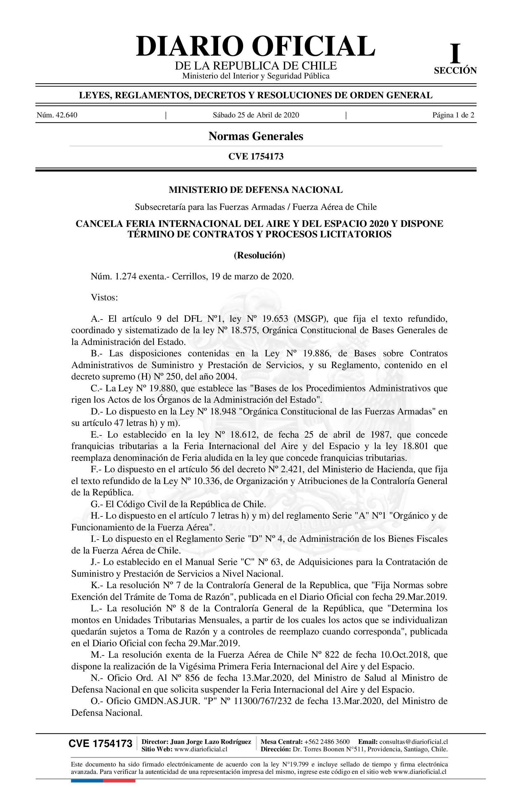 Ministerio de Defensa Nacional Cancela Feria Internacional Del Aire Y Del Espacio 2020 Y Dispone Término de Contratos Y Procesos Licitatorios (Resolución) 25-04-2020 Diario Oficial Edición Electrónica |