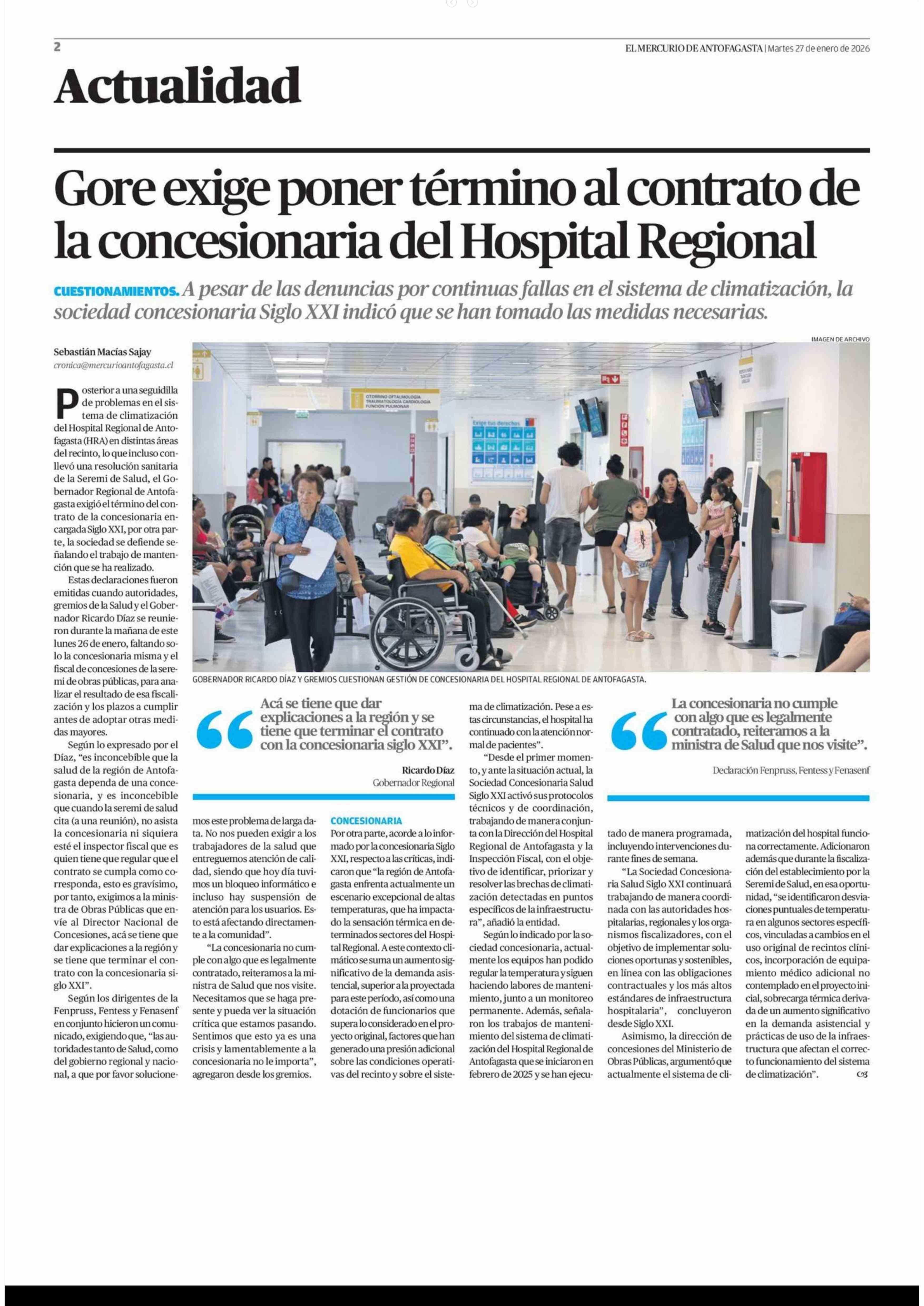 Gore exige poner término al contrato de la concesionaria del Hospital Regional 27-01-2026 El Mercurio de Antofagasta |