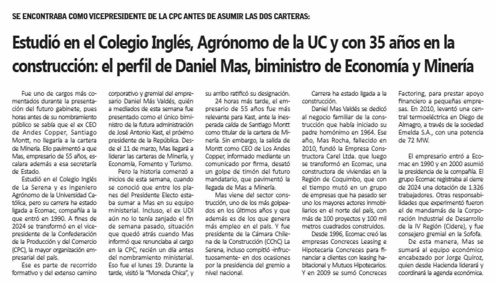 Título: Estudió en el Colegio Inglés, Agrónomo de la UC y con 35 años en la construcción: el perfil de Daniel Mas, biministro de Economía y Minería