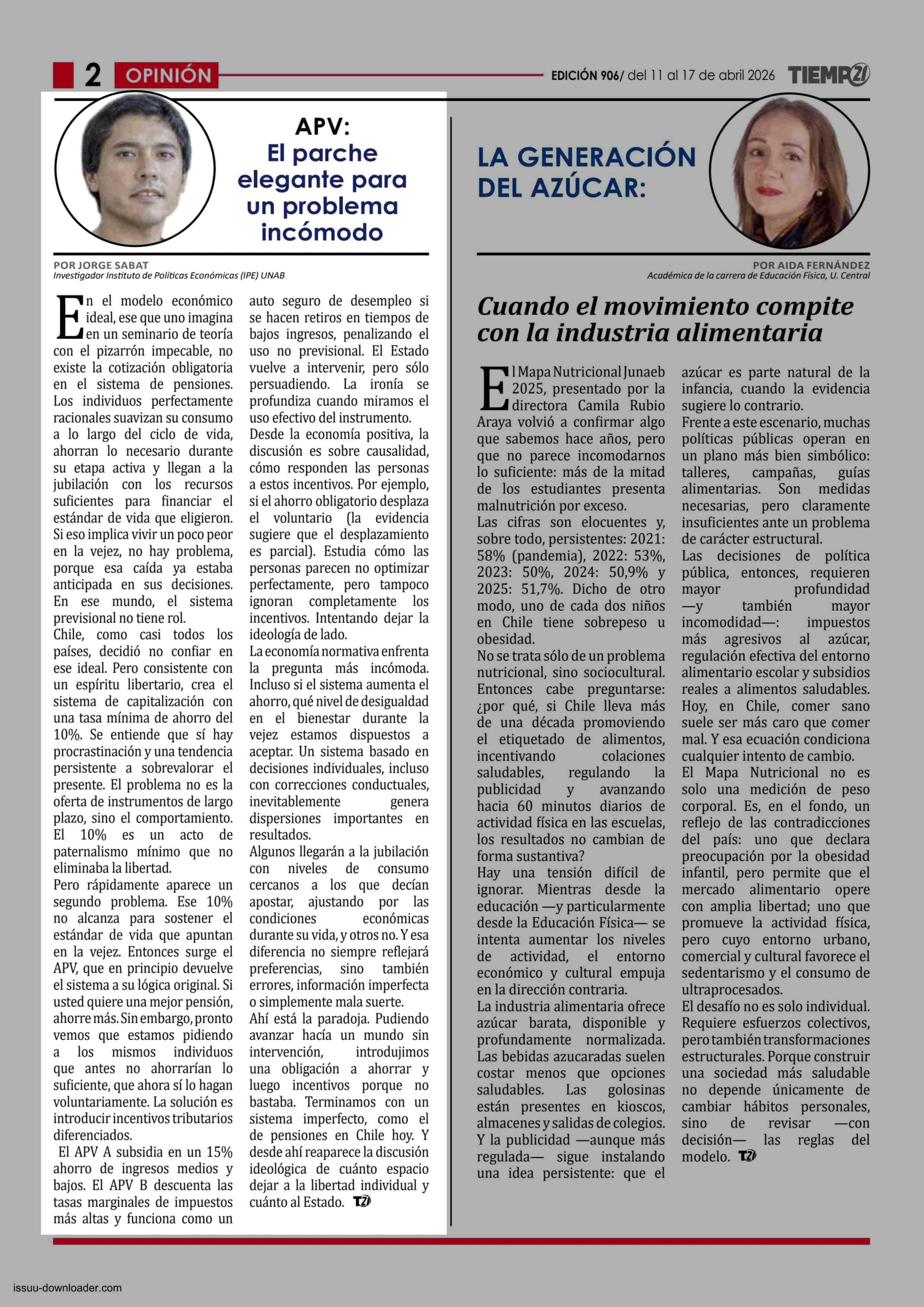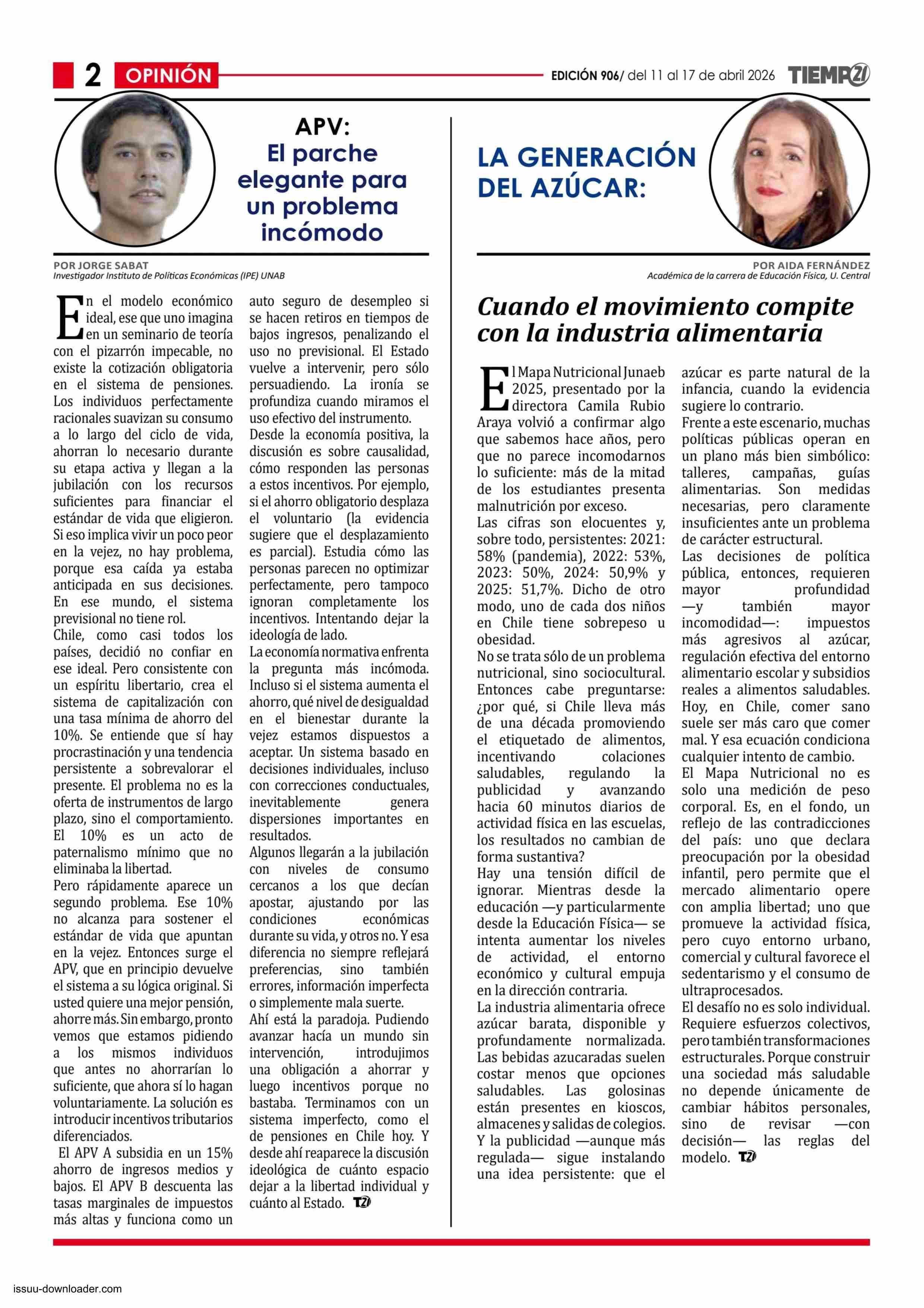 COLUMNAS DE OPINIÓN: APV: El parche elegante para un problema incómodo 11-04-2026 Tiempo 21 |