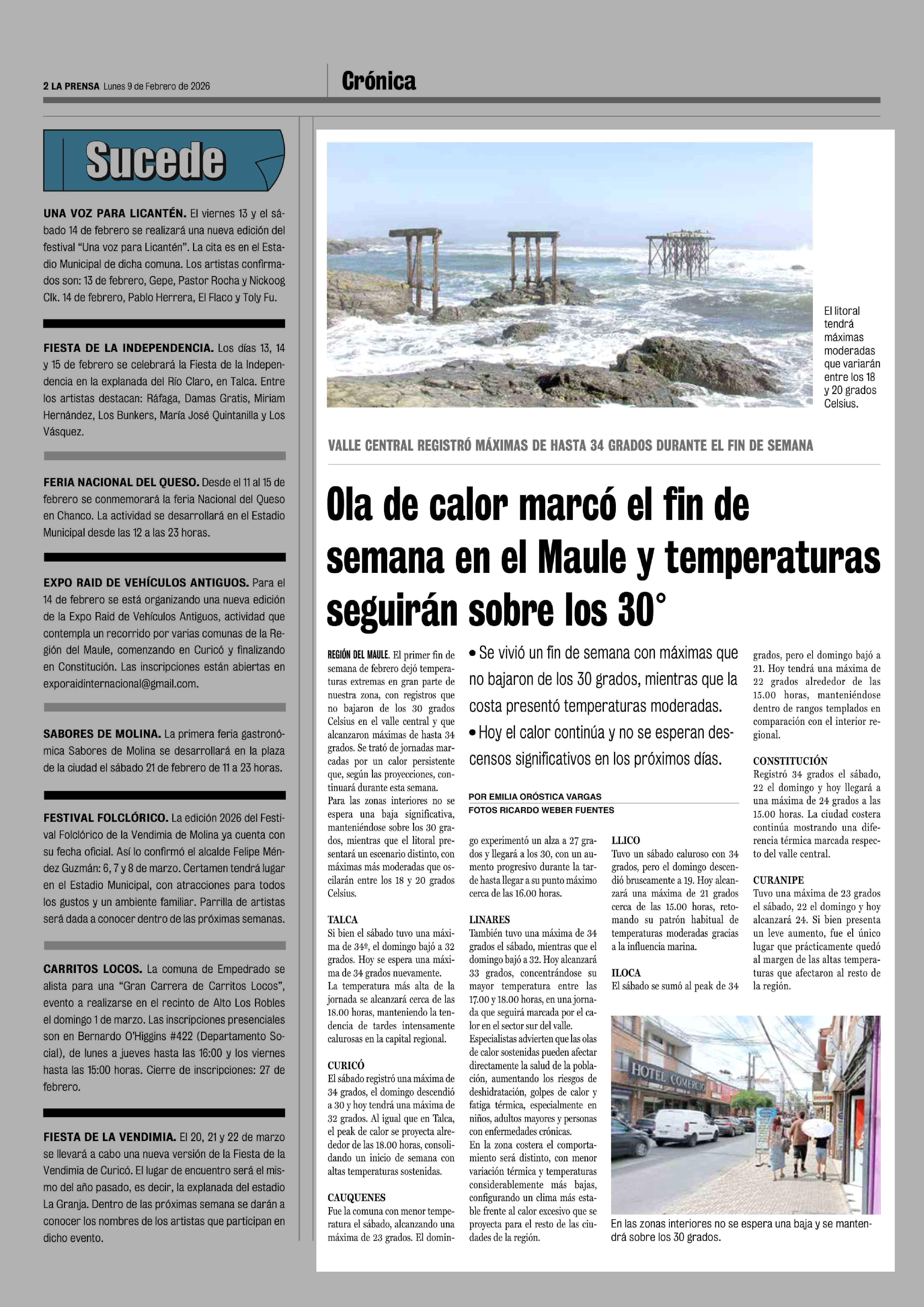 Ola de calor marcó el fin de semana en el Maule y temperaturas seguirán sobre los 30° 09-02-2026 La Prensa de Curicó |