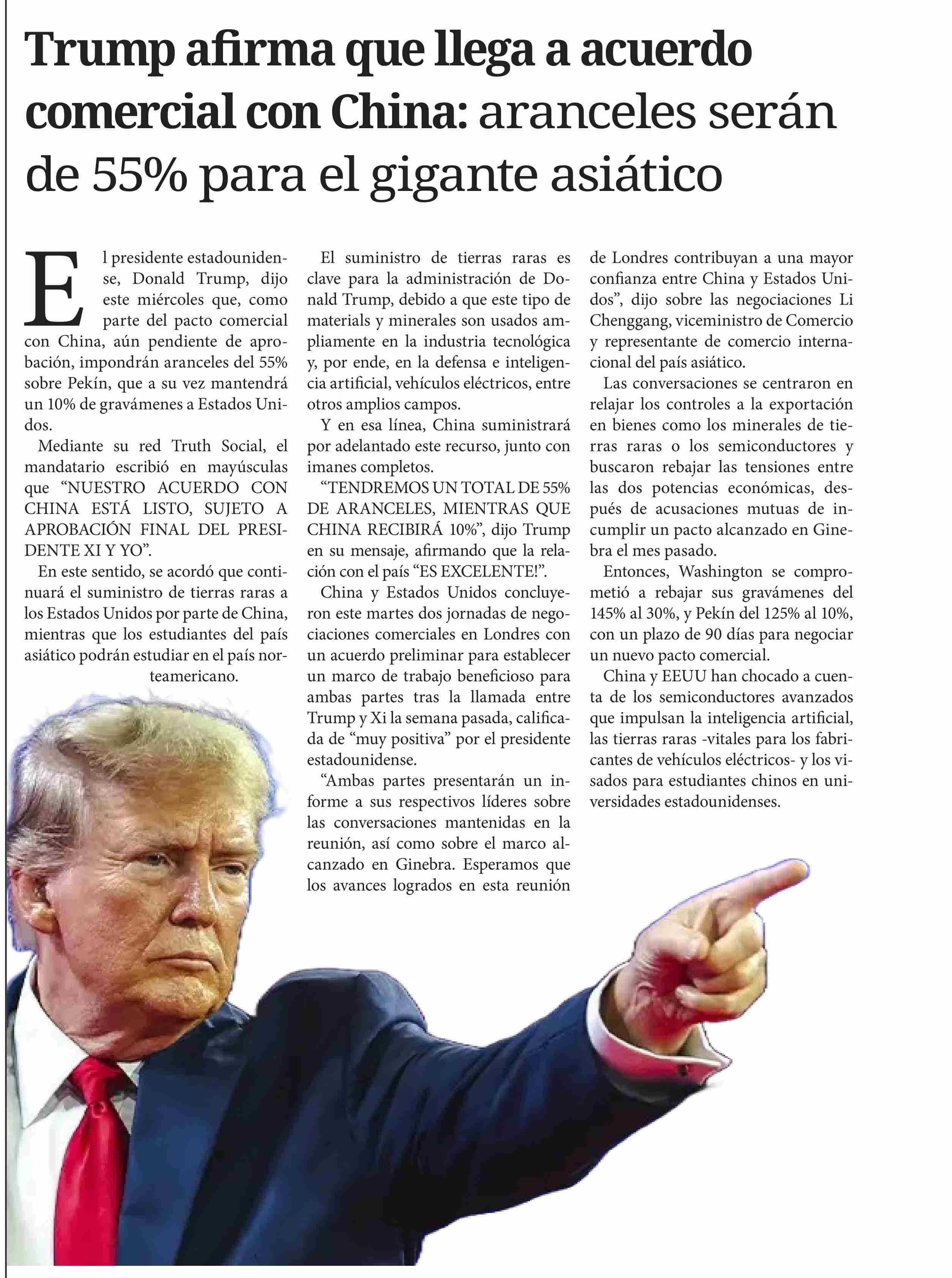 | Título: | Trump afirma que llega a acuerdo comercial con China: aranceles serán de 55% para el gigante asiático |