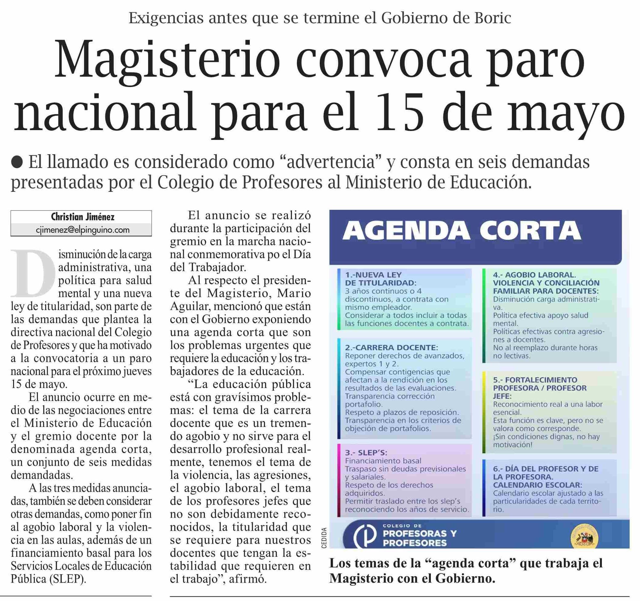 | Título: | Magisterio convoca paro nacional para el 15 de mayo |