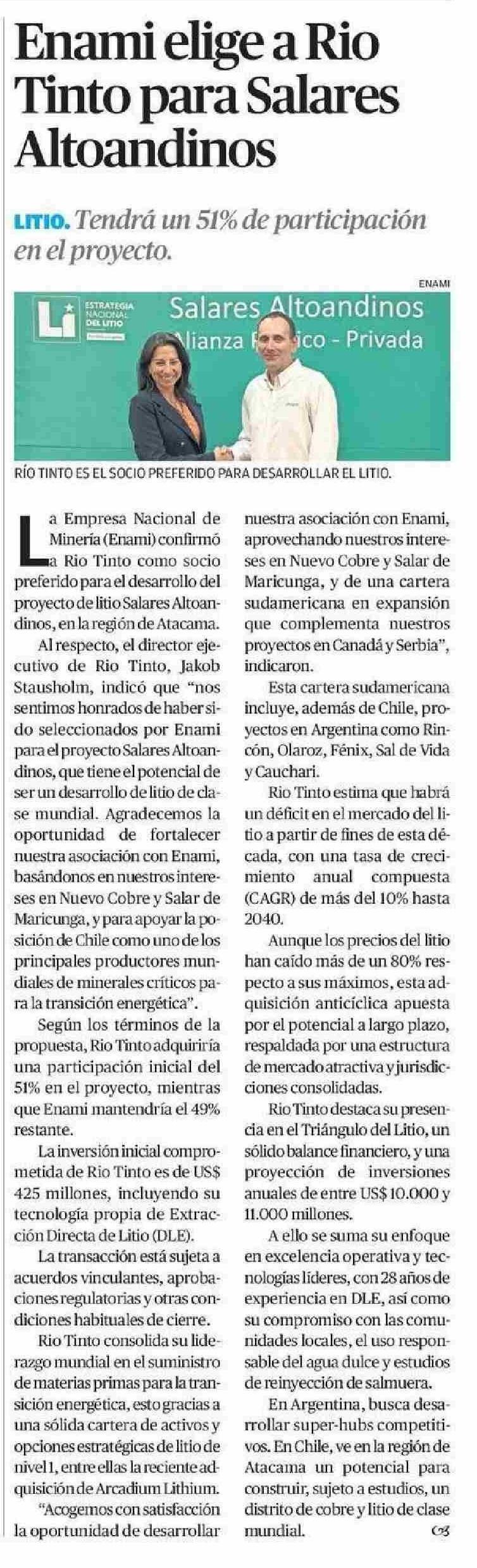 Enami elige a Rio Tinto para Salares Altoandinos 23-05-2025 El Diario de Atacama |