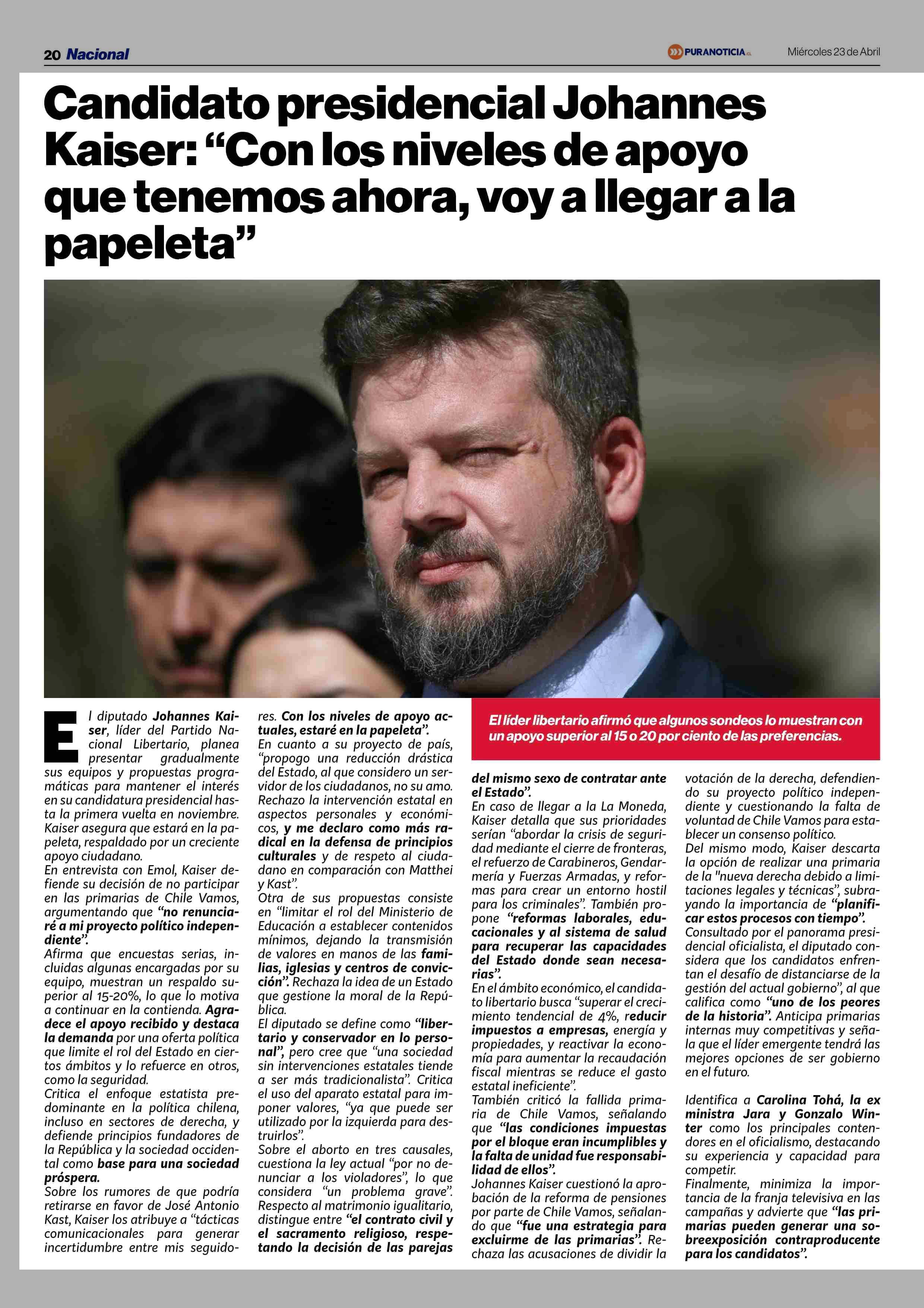 Candidato presidencial Johannes Kaiser: “Con los niveles de apoyo que tenemos ahora, voy a llegar a la papeleta” 23-04-2025 Puranoticia.cl |