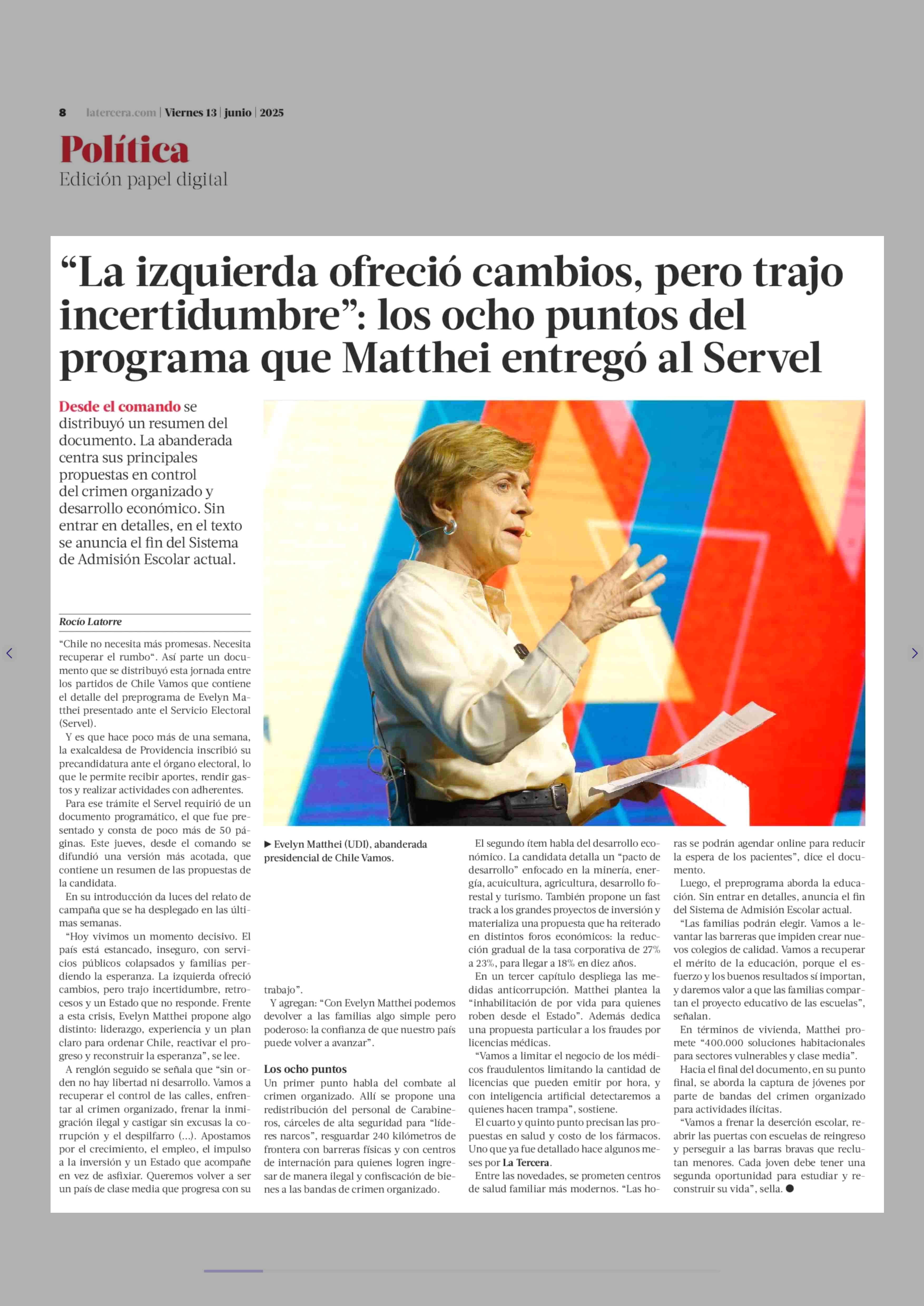 “La izquierda ofreció cambios, pero trajo Incertidumbre”: los ocho puntos del programa que Matthei entregó al Servel 13-06-2025 La Tercera |