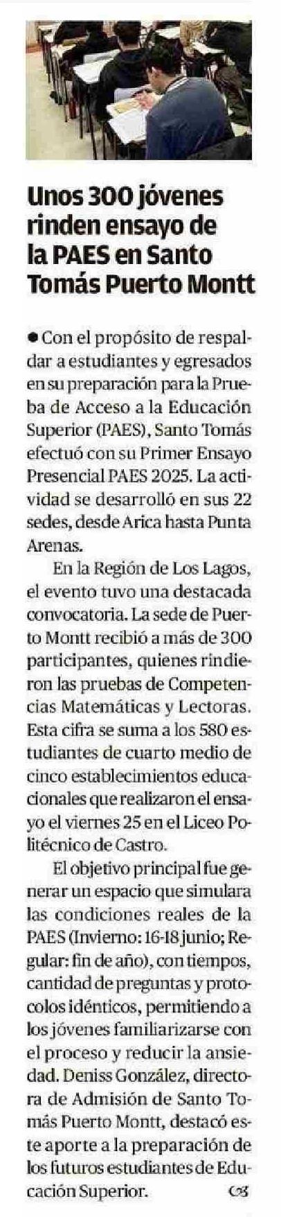 Unos 300 jóvenes rinden ensayo de la PAES en Santo Tomás Puerto Montt 04-05-2025 El Llanquihue |