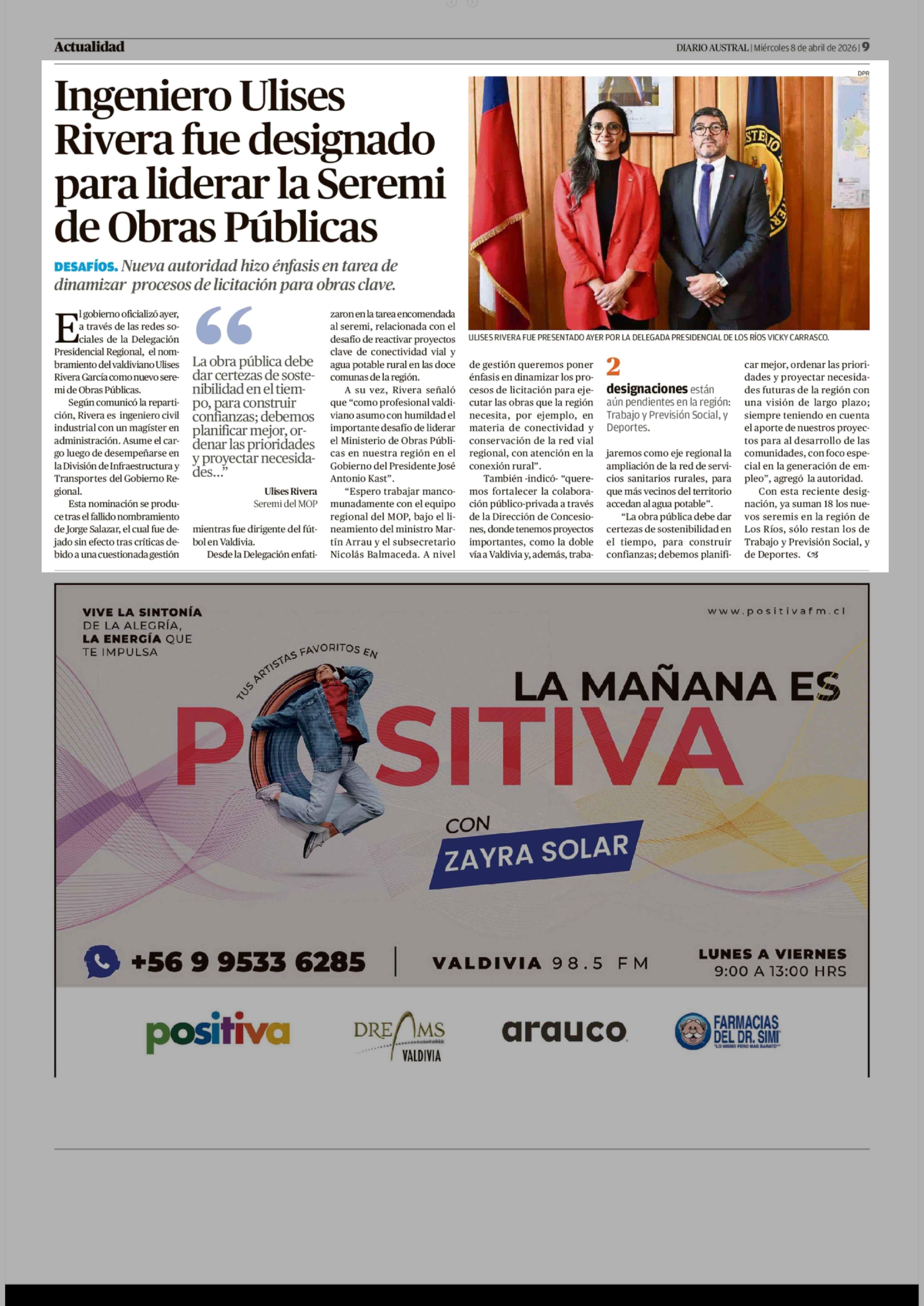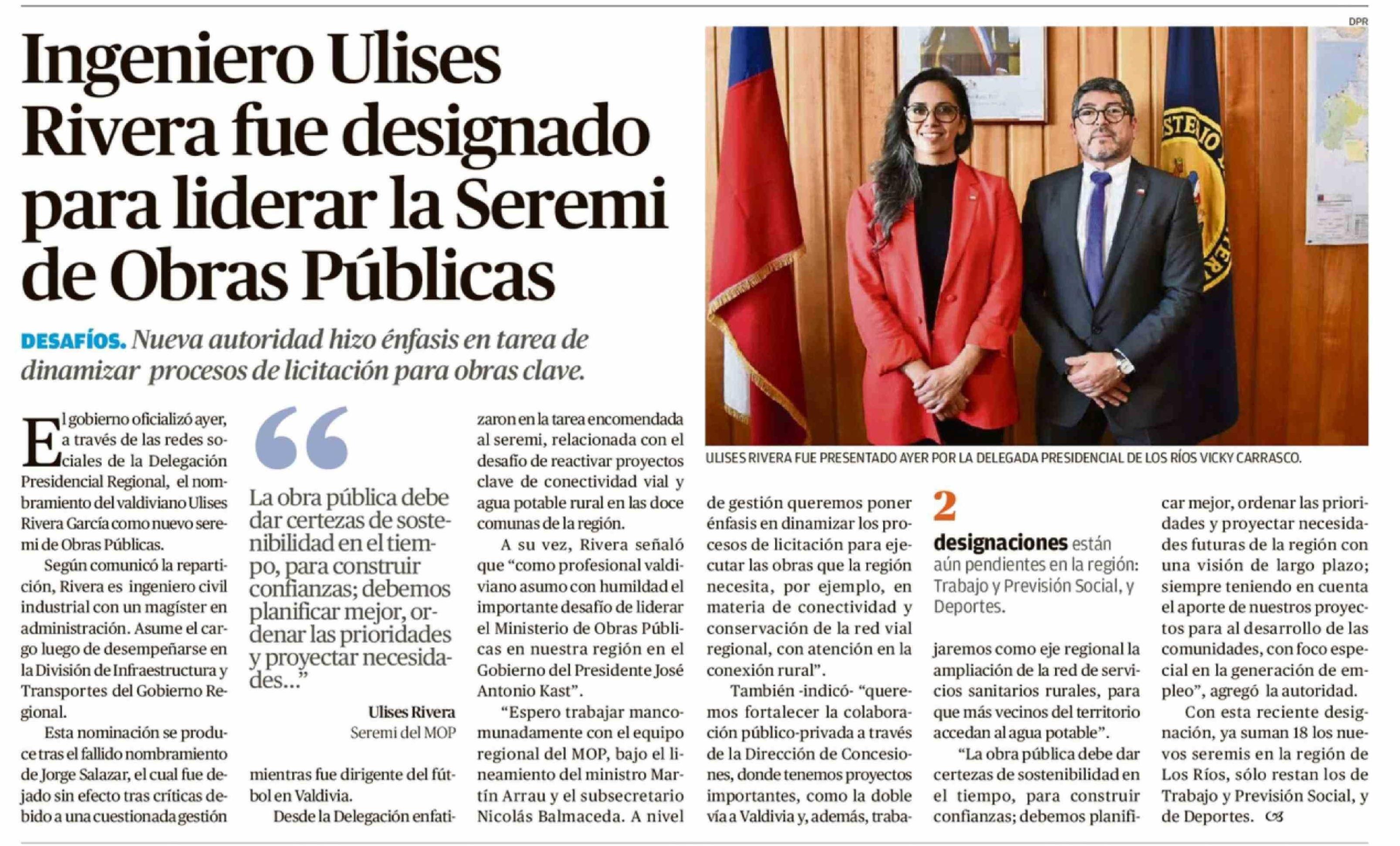 Ingeniero Ulises Rivera fue designado para liderar la Seremi de Obras Públicas 08-04-2026 Diario Austral Región de Los Ríos |