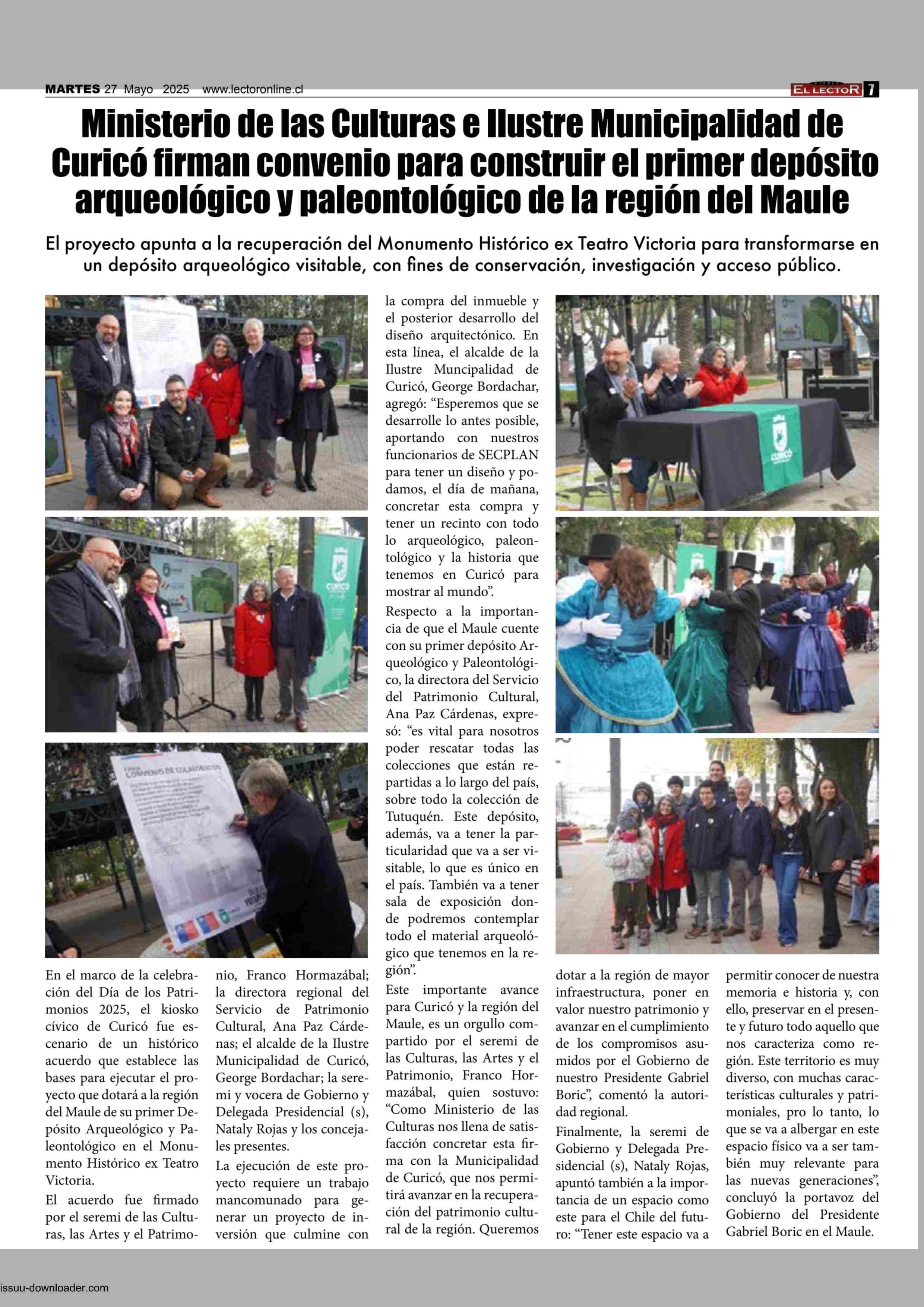 Ministerio de las Culturas e Ilustre Municipalidad de Curicó firman convenio para construir el primer depósito arqueológico y paleontológico de la región del Maule 27-05-2025 El Lector |
