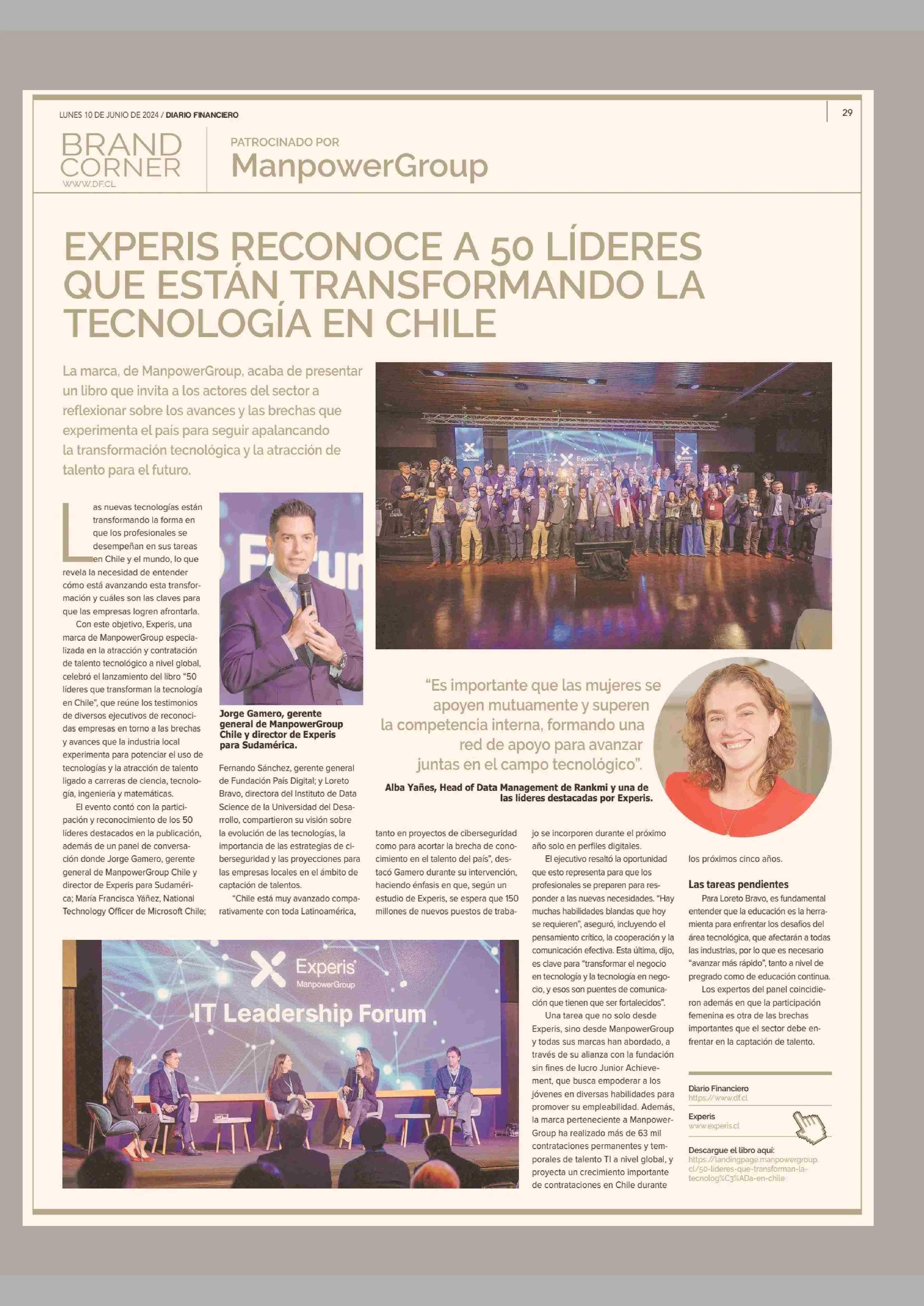 EXPERIS RECONOCE A 50 LÍDERES QUE ESTÁN TRANSFORMANDO LA TECNOLOGÍA EN CHILE 10-06-2024 Diario Financiero |