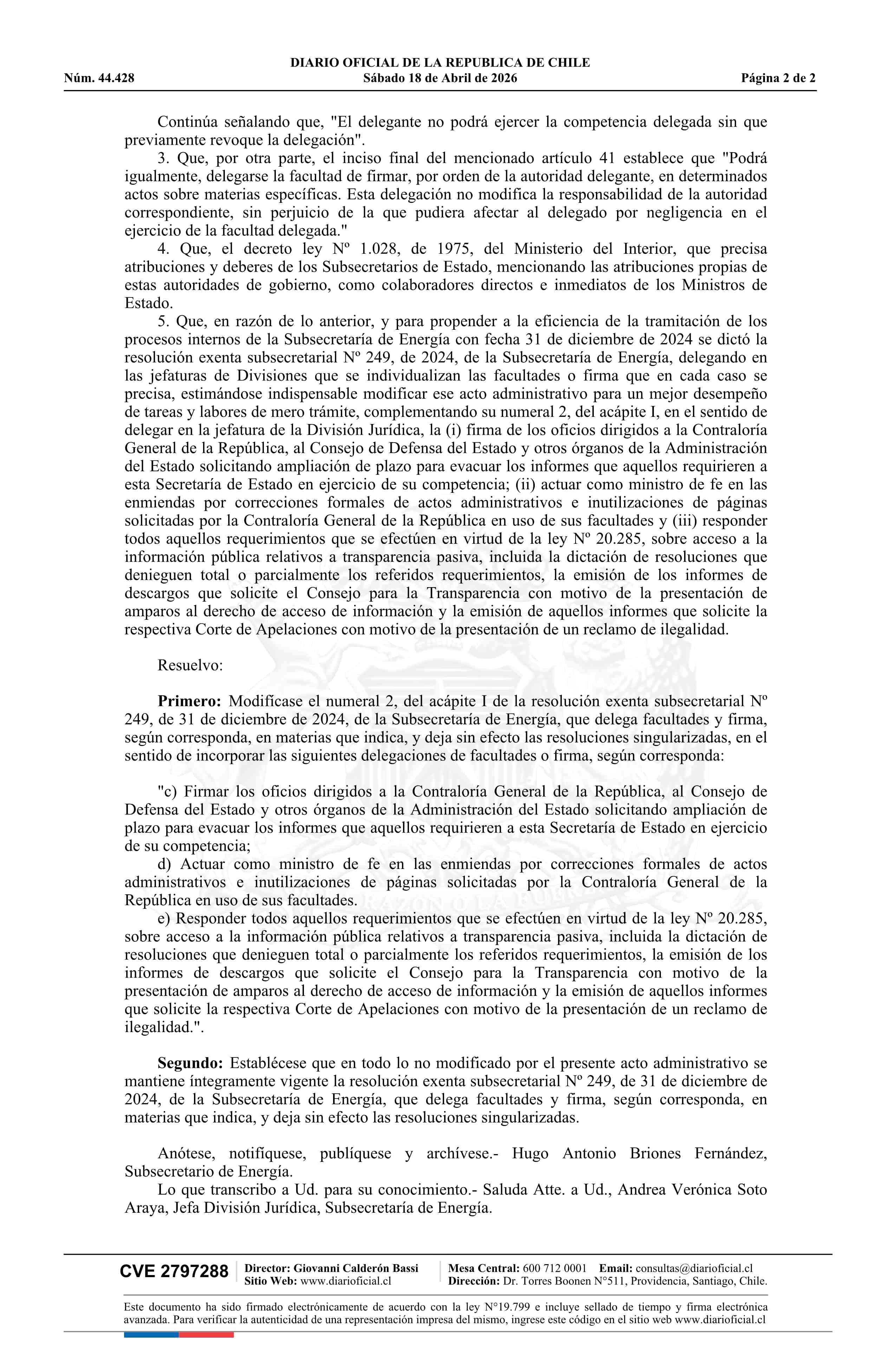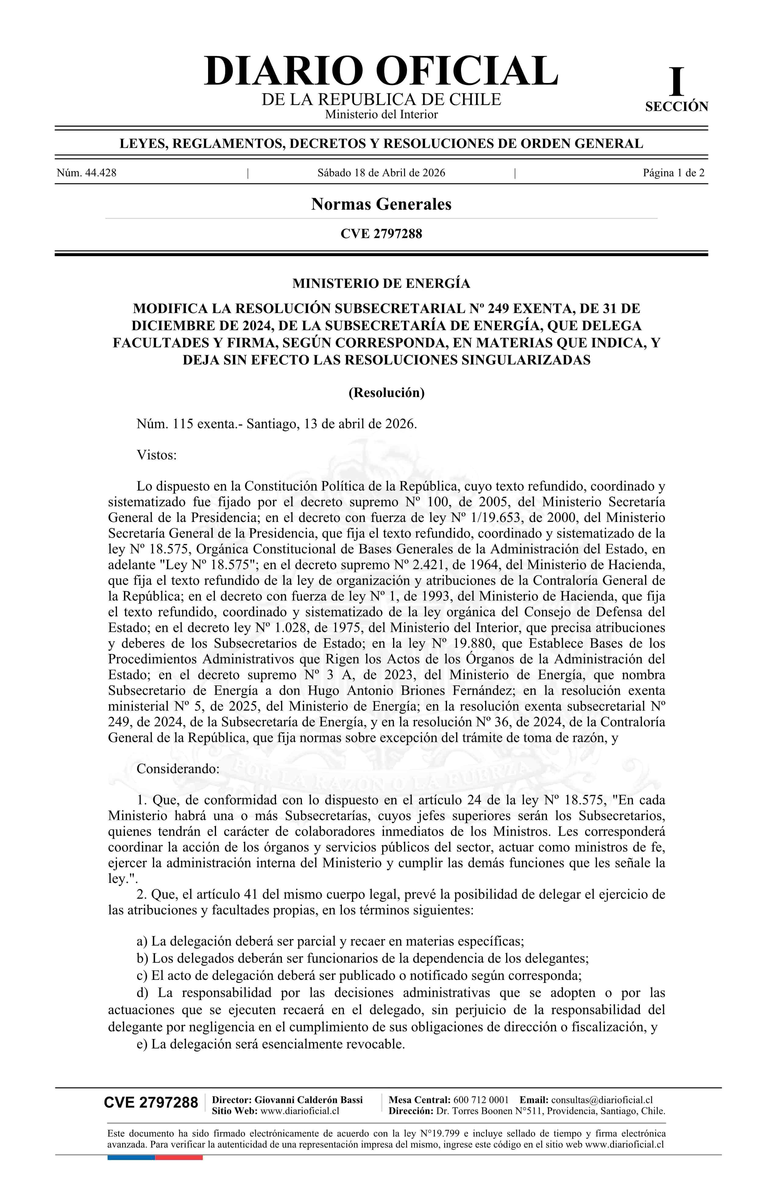| Título: | Resolución exenta número 115, de 2026.- Modifica la resolución Nº 249 exenta, de 2024, que delega facultades y firma, según corresponda, en materias que indica y deja sin efecto las resoluciones singularizadas |