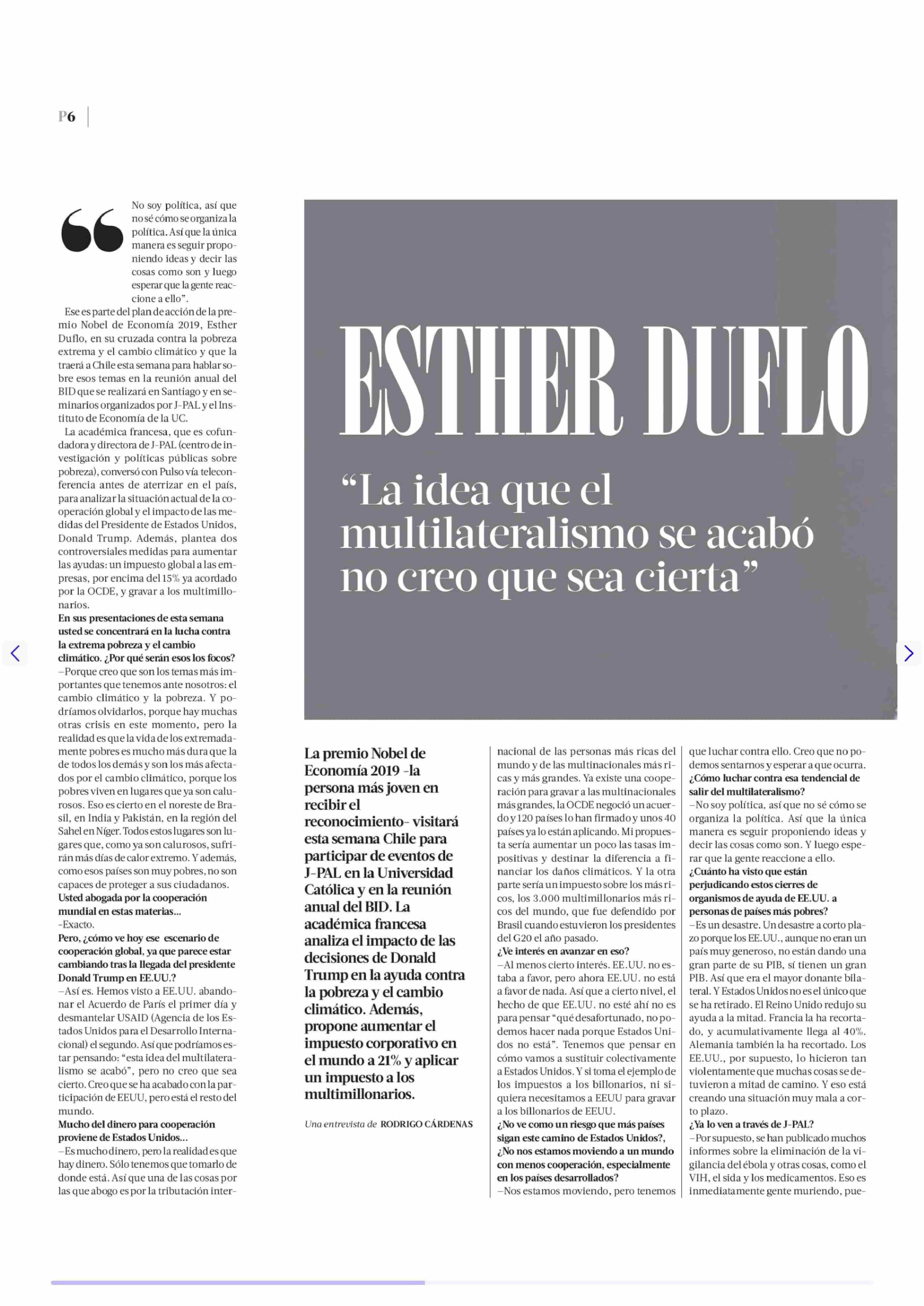 | Título: | ESTHER DUFLO “La idea que el multilateralismo se acabó no creo que sea cierta” |
