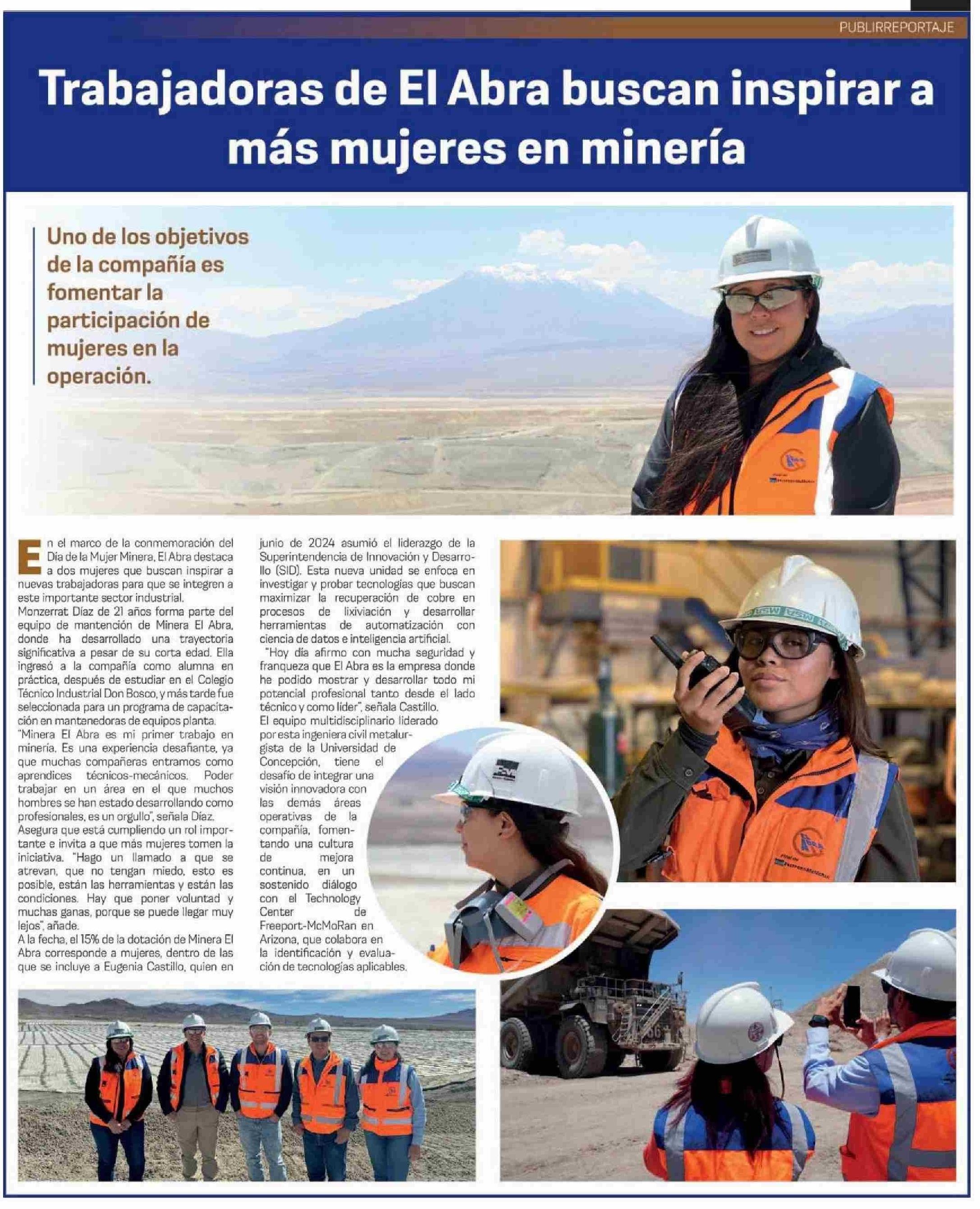 | Título: | a dos mujeres que buscan inspirar a nuevas trabajadoras para que se integren a este importante sector industrial. Monzerrat Díaz de 21 años forma parte del equipo de mantención de Minera El Abra. donde ha desarrollado una trayectoria significativa a pesar de su corta edad. Ella ingresó a la compañía |