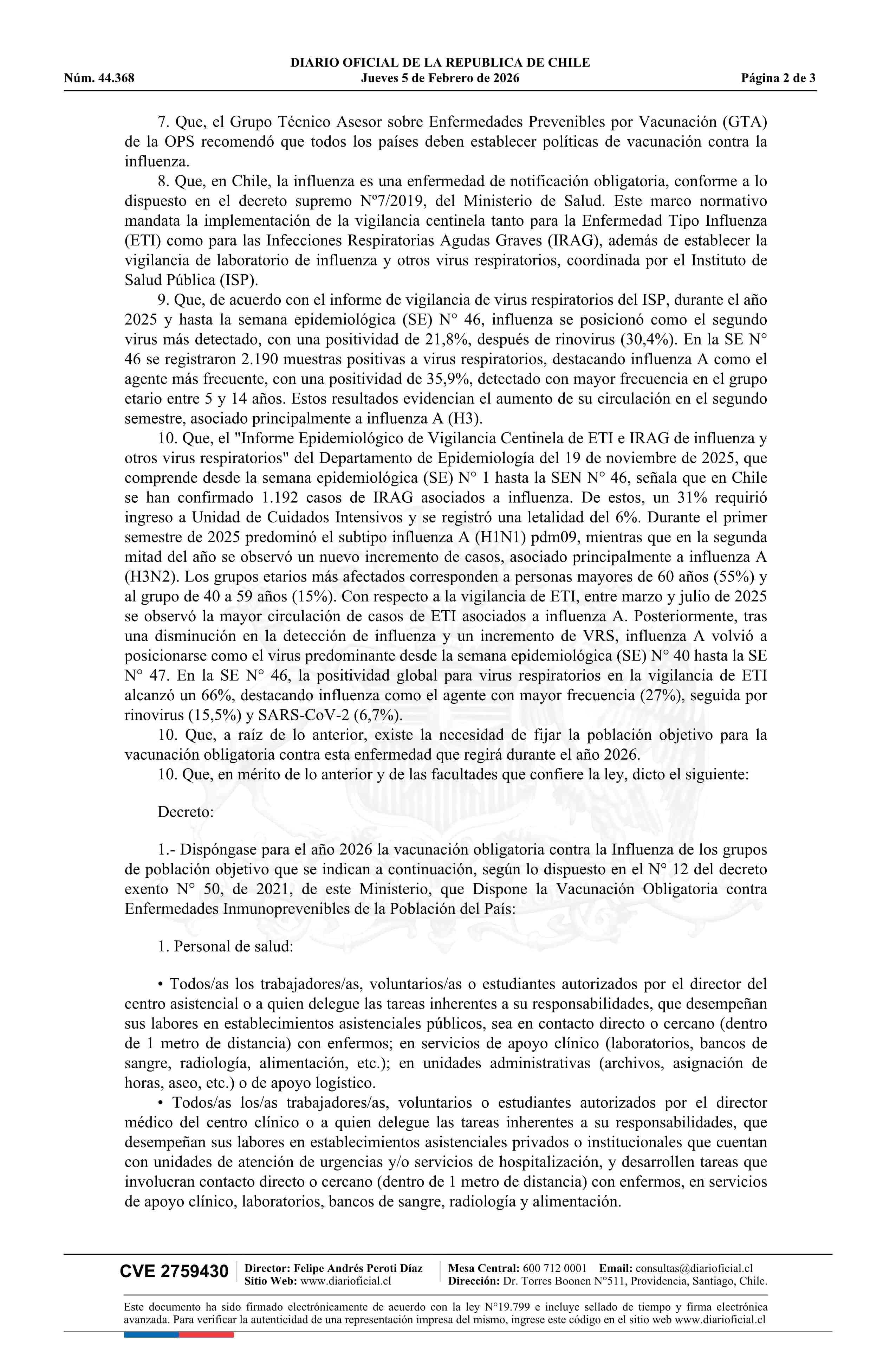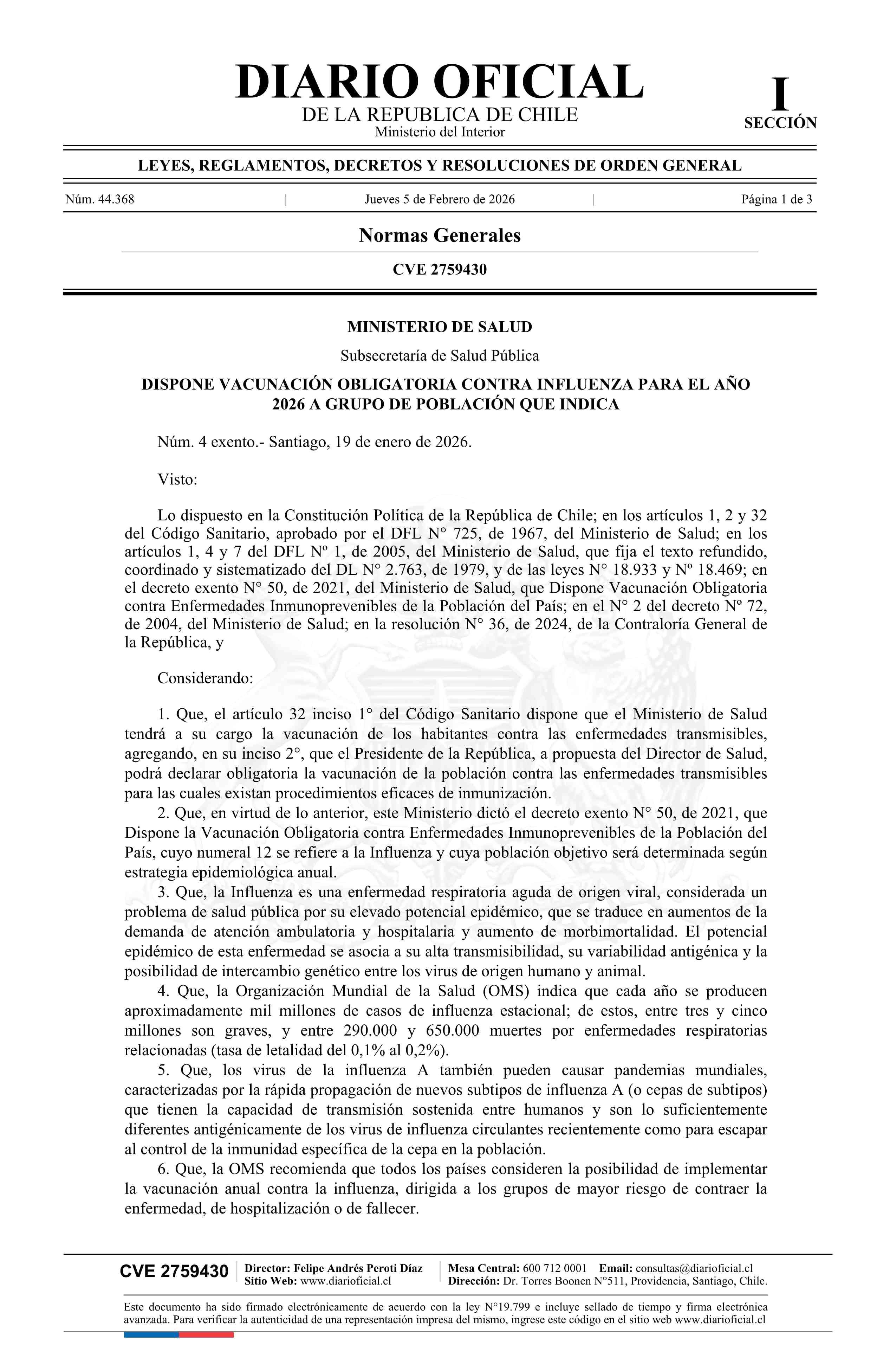 Título: Decreto exento número 4, de 2026.- Dispone vacunación obligatoria contra influenza para el año 2026 a grupo de población que indica