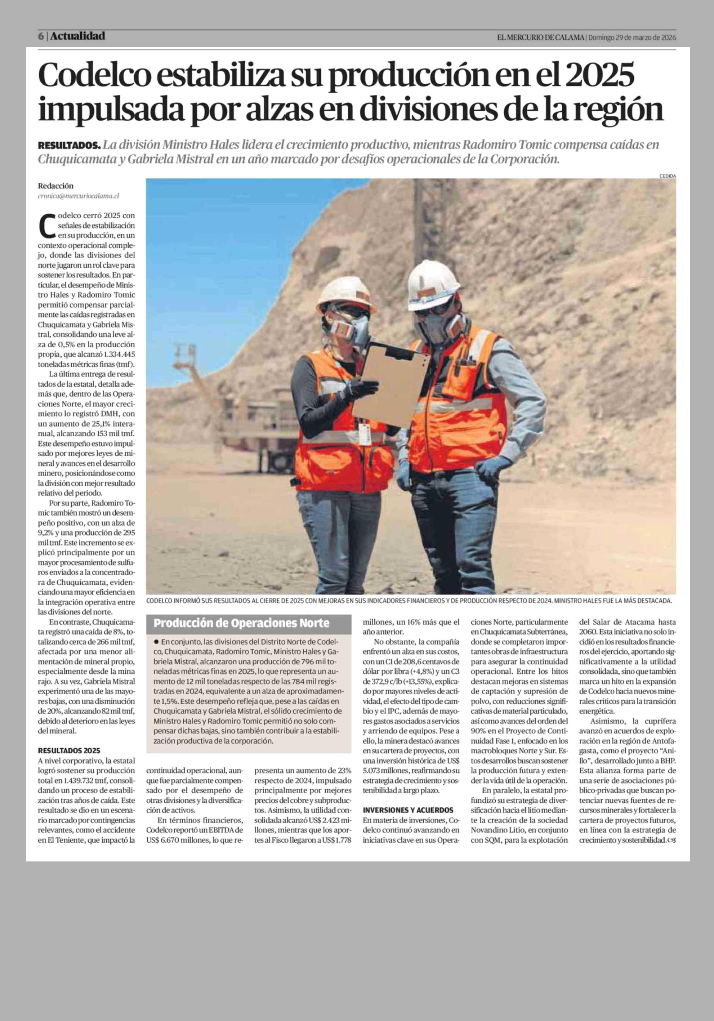 Codelco estabiliza su producción en el 2025 impulsada por alzas en divisiones de la región 29-03-2026 El Mercurio de Calama |