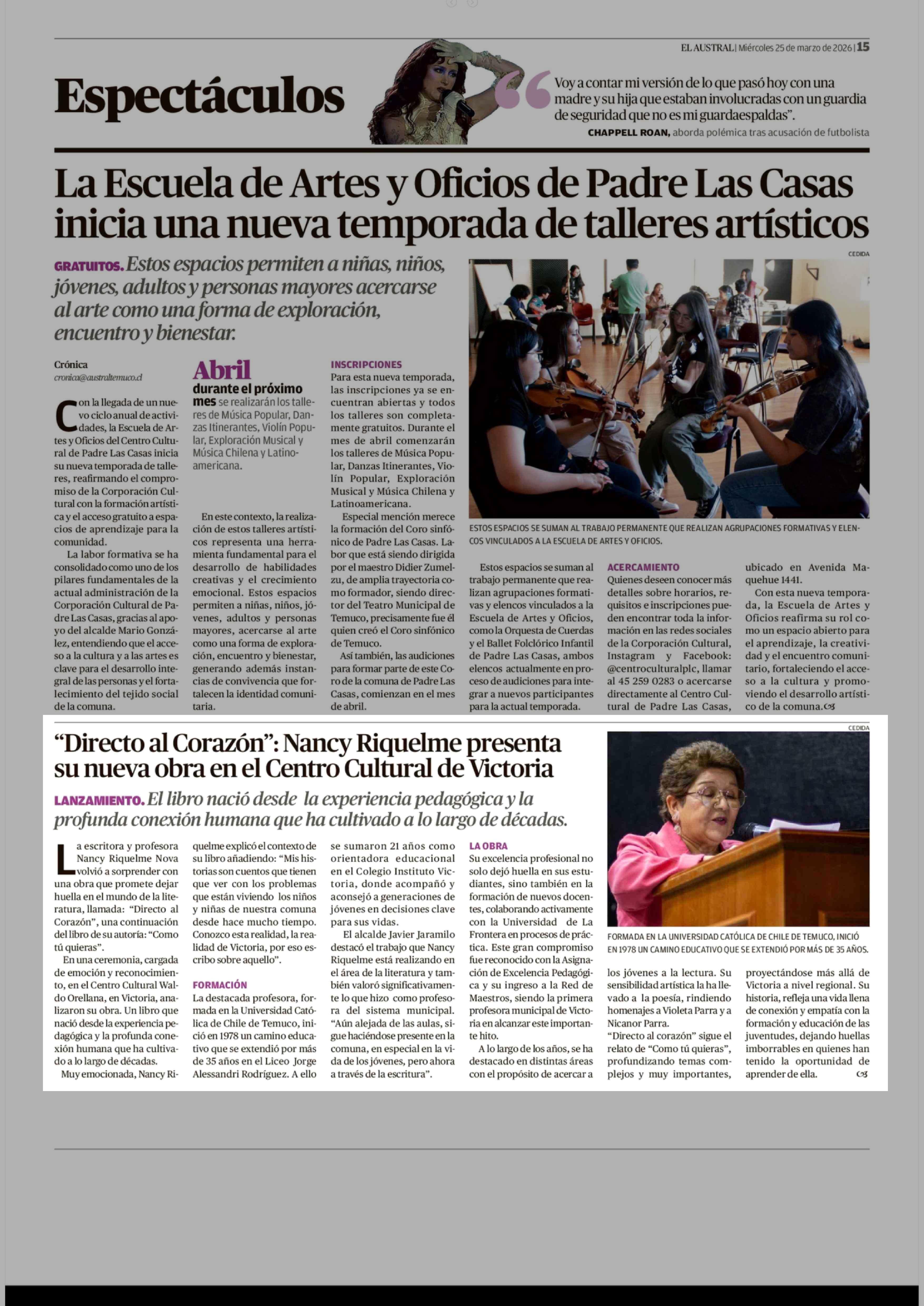 "Directo al Corazón": Nancy Riquelme presenta su nueva obra en el Centro Cultural de Victoria 25-03-2026 El Austral de la Araucanía |