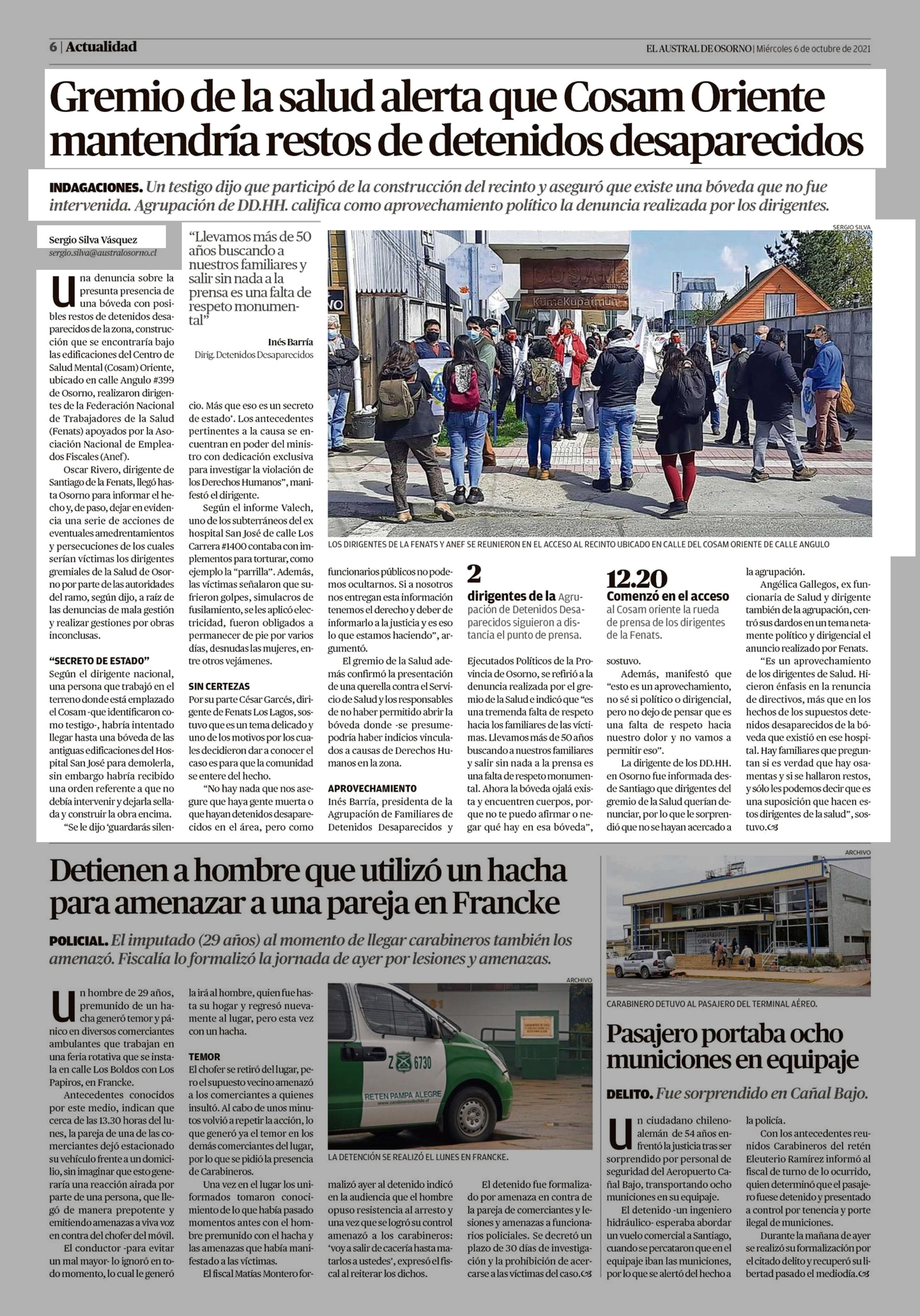 Gremio de la salud alerta que Cosam Oriente mantendría restos de detenidos desaparecidos 06-10-2021 El Austral de Osorno |