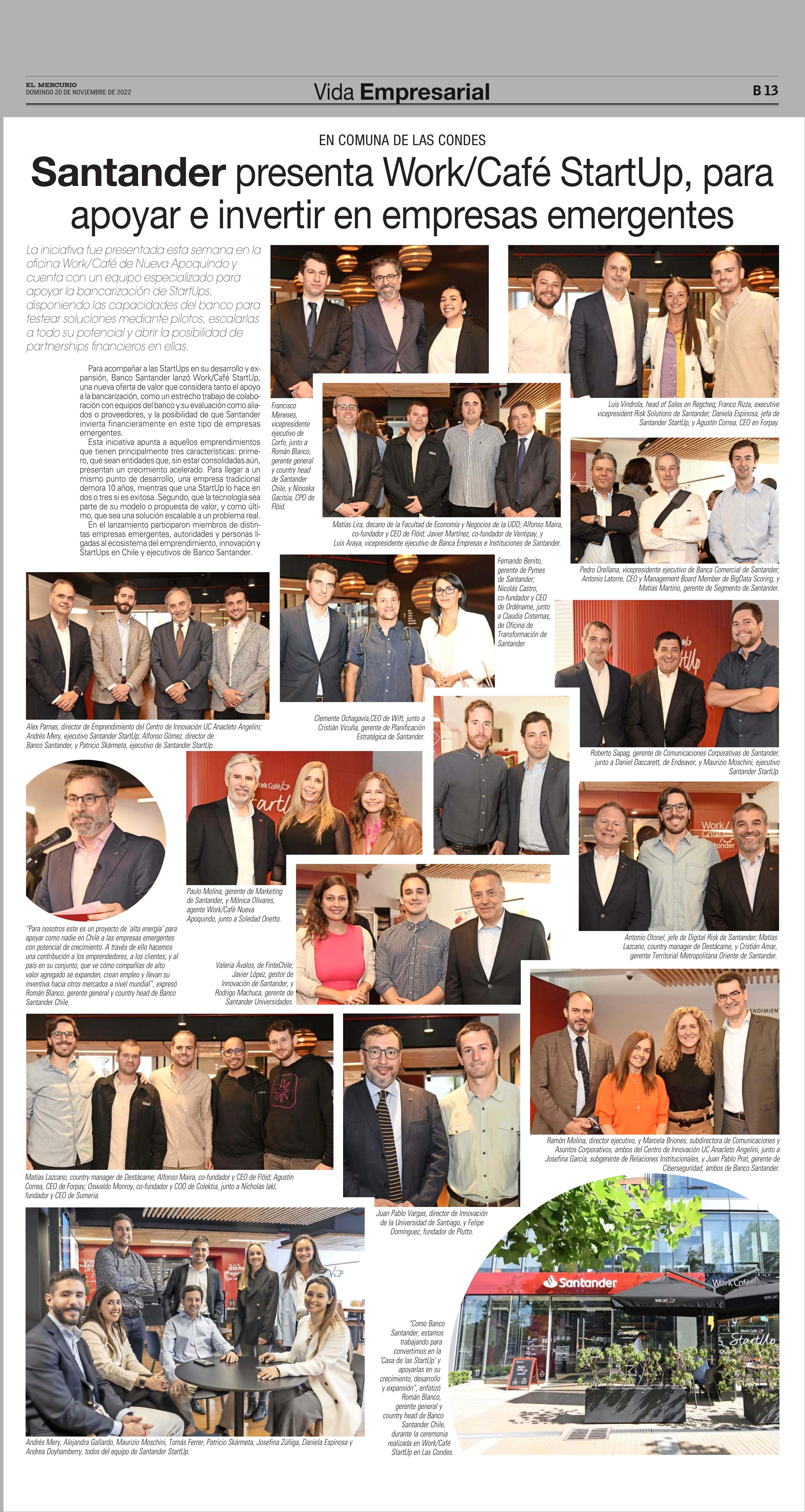 Santander presenta Work/Café Start Up, para apoyar e Invertir en empresas emergentes 20-11-2022 El Mercurio |