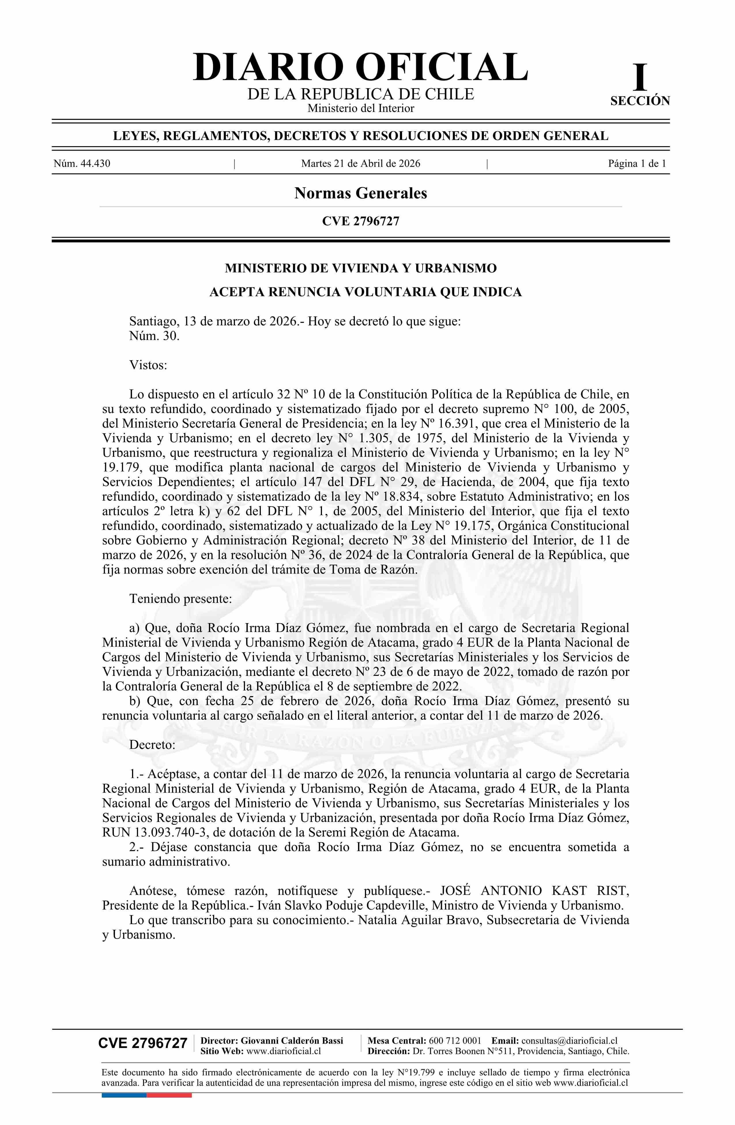 Decreto número 30, de 2026.- Acepta renuncia voluntaria de doña Rocío Irma Díaz Gómez al cargo de Secretaria Regional Ministerial de Vivienda y Urbanismo Región de Atacama