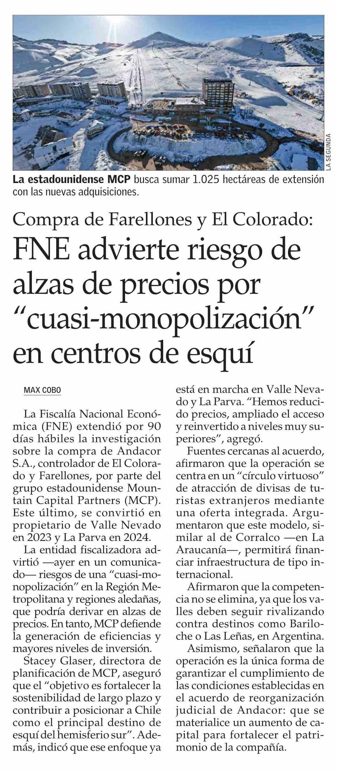 FNE advierte riesgo de alzas de precios por “cuasi-monopolización” en centros de esquí 14-01-2026 El Mercurio |