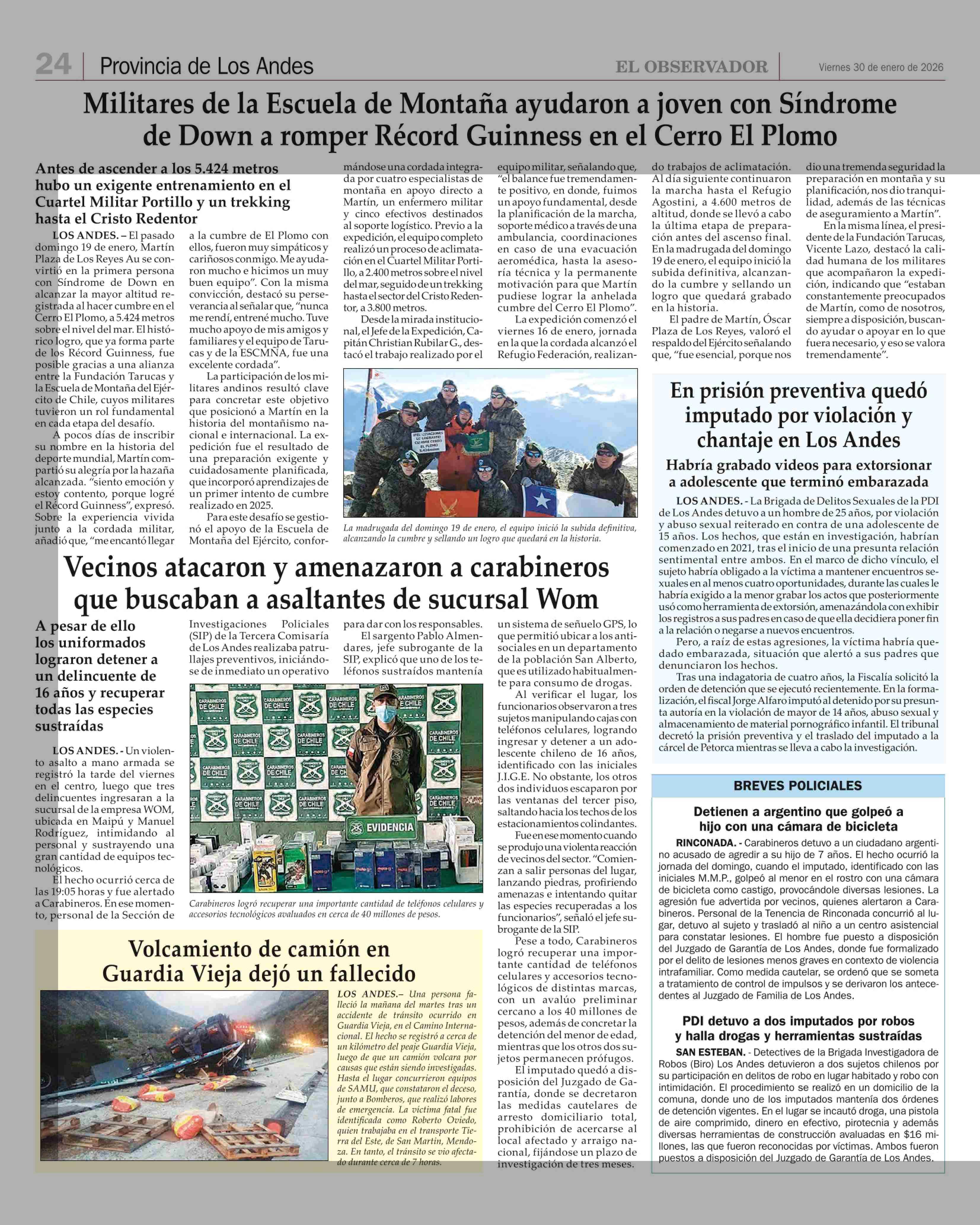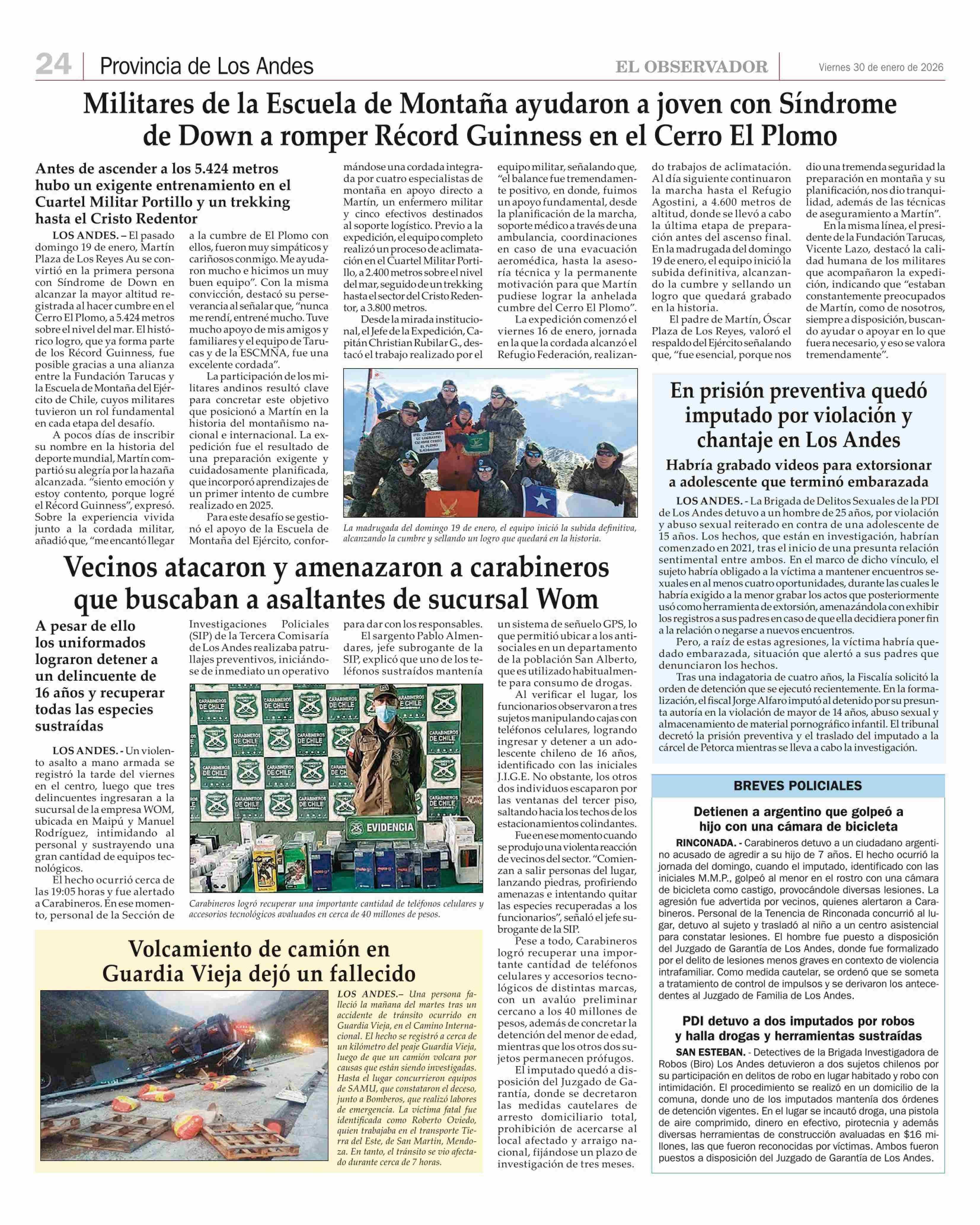 Militares de la Escuela de Montaña ayudaron a joven con Síndrome de Down a romper Récord Guinness en el Cerro El Plomo 30-01-2026 El Observador |