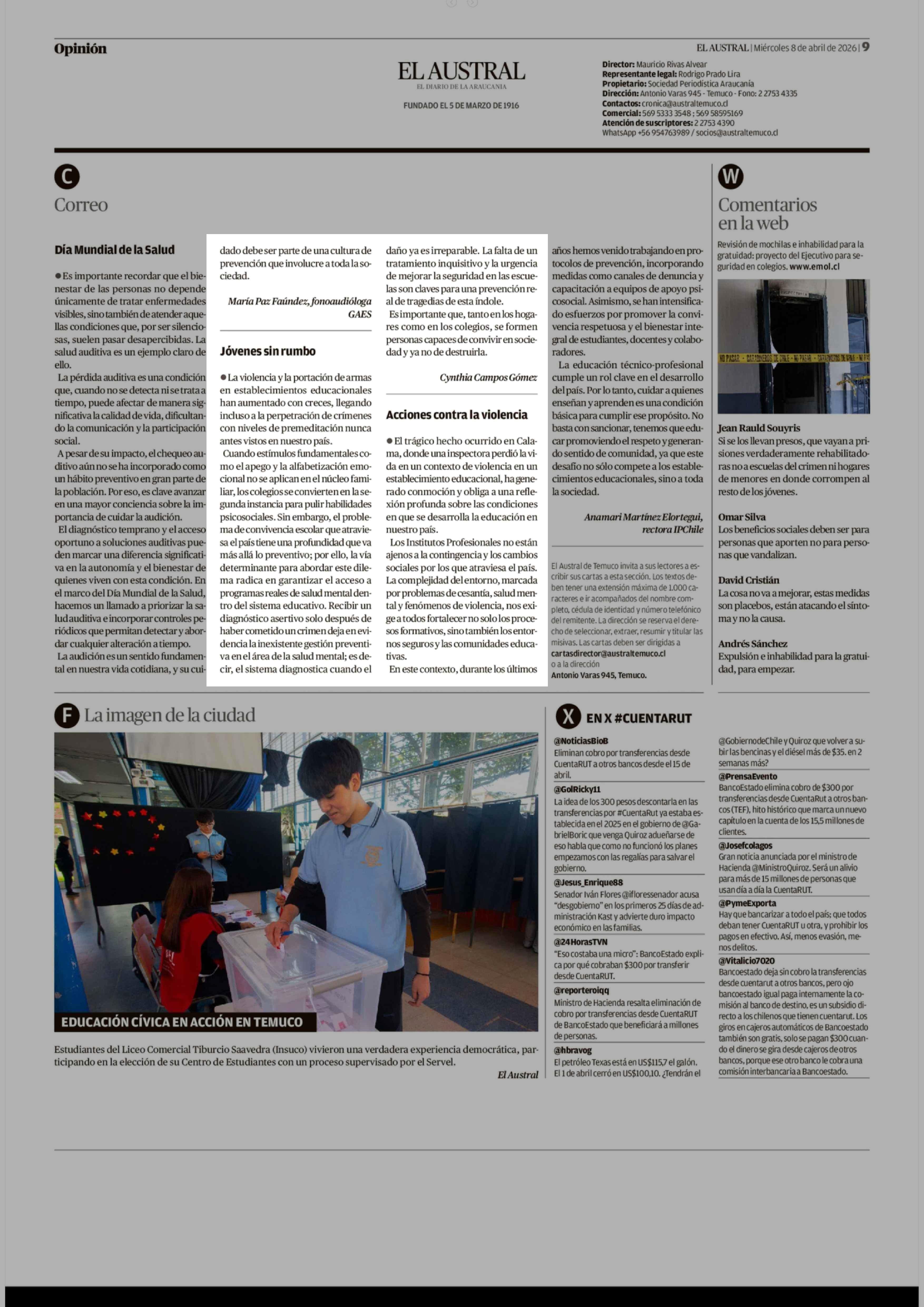 Cartas: Jóvenes sin rumbo 08-04-2026 El Austral de la Araucanía |
